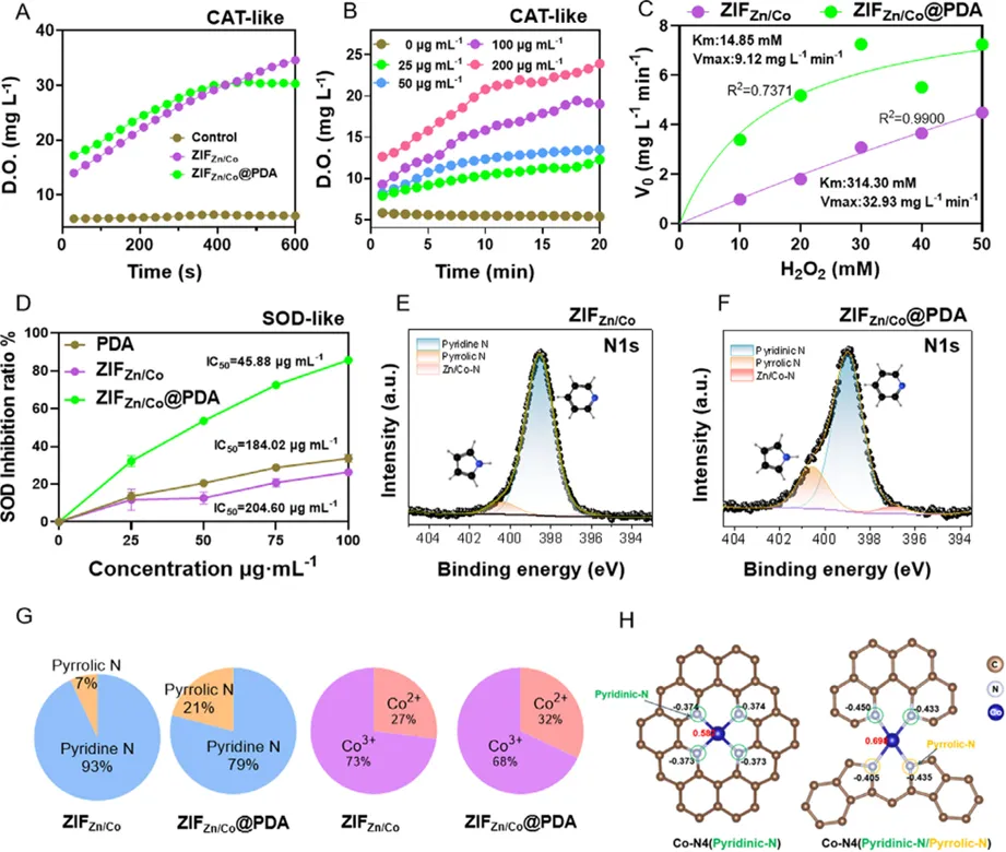 接下来作者重点看催化性能。结果显示,PDA重构后材料对H2O2依旧保持良好CAT样活性,但更关键的是SOD样活性被明显激活,IC50大幅下降。配合XPS精细分析可以看到,界面重构改变了氮配位形式和Co价态,让活性中心具备更强的电子调控能力,这也是后续能把ROS全链路清除掉的关键。