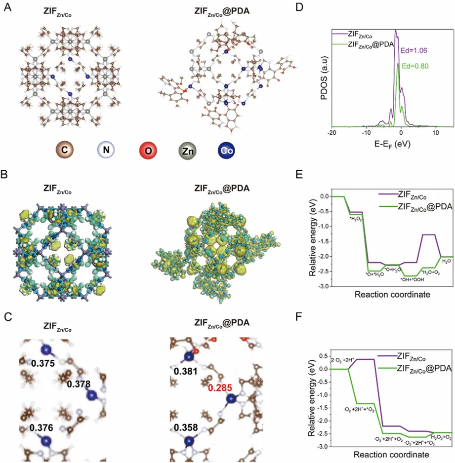 作者用TEM、EDS、XRD、UV-vis、FTIR、Raman、XPS和BET等手段,从形貌、元素分布、晶体结构、表面电位和孔结构多个层面证明:PDA确实包覆并重塑了ZIFZn/Co表面,同时主体骨架并没有被彻底破坏,而是形成了更有利于反应物进入的层级核壳界面。