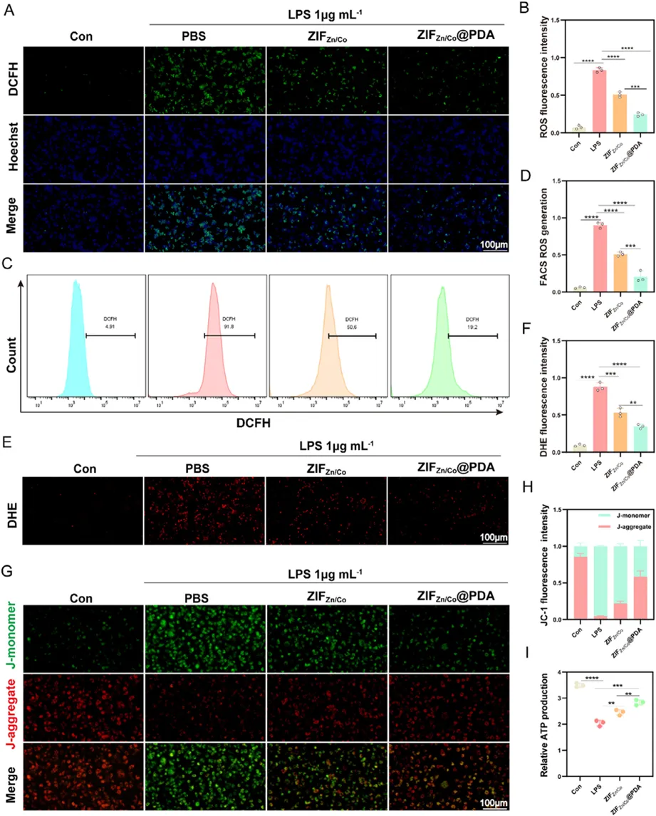 作者在LPS刺激的RAW264.7模型中发现,ZIFZn/Co@PDA能明显降低总ROS和⋅O2−水平,同时恢复JC-1反映的线粒体膜电位,提升ATP生成,并改善细胞内钙稳态。也就是说,它不是只在试管里好看,而是真把氧化应激源头和线粒体损伤一起往回拉了。