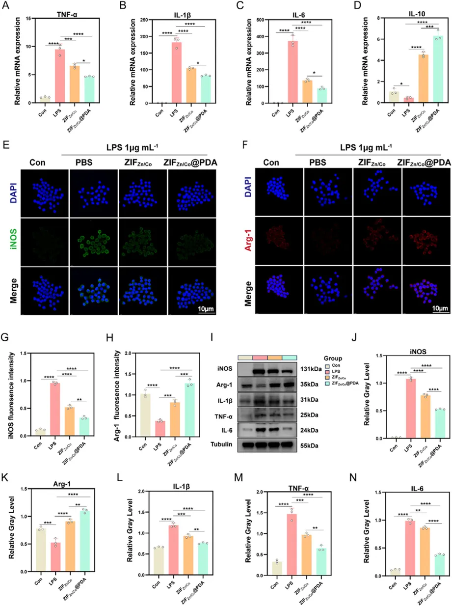 Figure 5:ZIFZn/Co@PDA在体外的抗炎作用及其促进巨噬细胞由M1向M2重极化的结果。