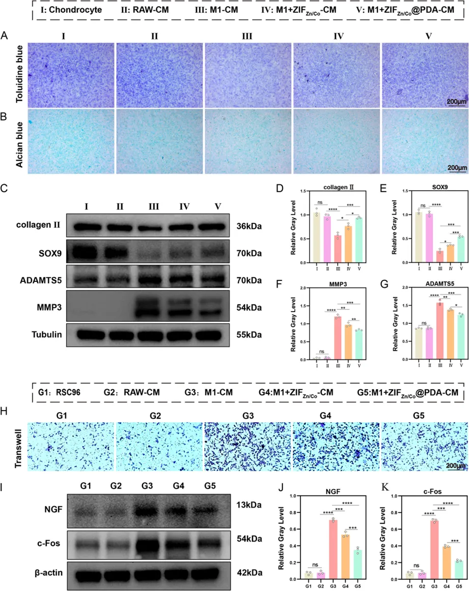作者没有停留在巨噬细胞本身,而是继续做了条件培养基实验。结果很直观:被该材料“净化”过的巨噬细胞微环境,可以减轻软骨细胞蛋白聚糖流失,提升Collagen II和SOX9,降低ADAMTS5和MMP3;同时还能抑制RSC96细胞迁移及NGF、c-Fos表达,提示其对神经异常激活也有压制作用。