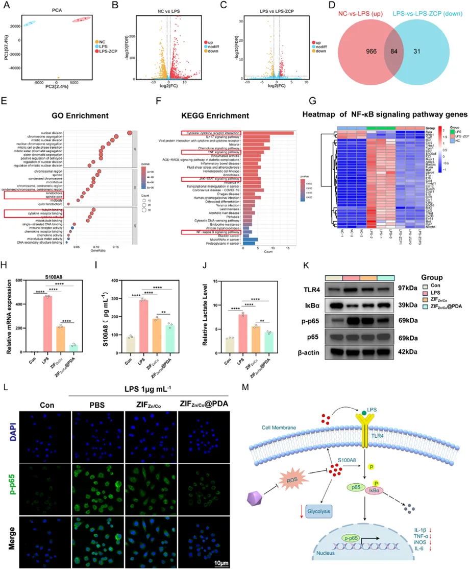 Figure 7:ZIFZn/Co@PDA的抗炎与免疫调控机制,重点展示RNA-seq、S100A8验证、NF-κB信号及机制示意图。