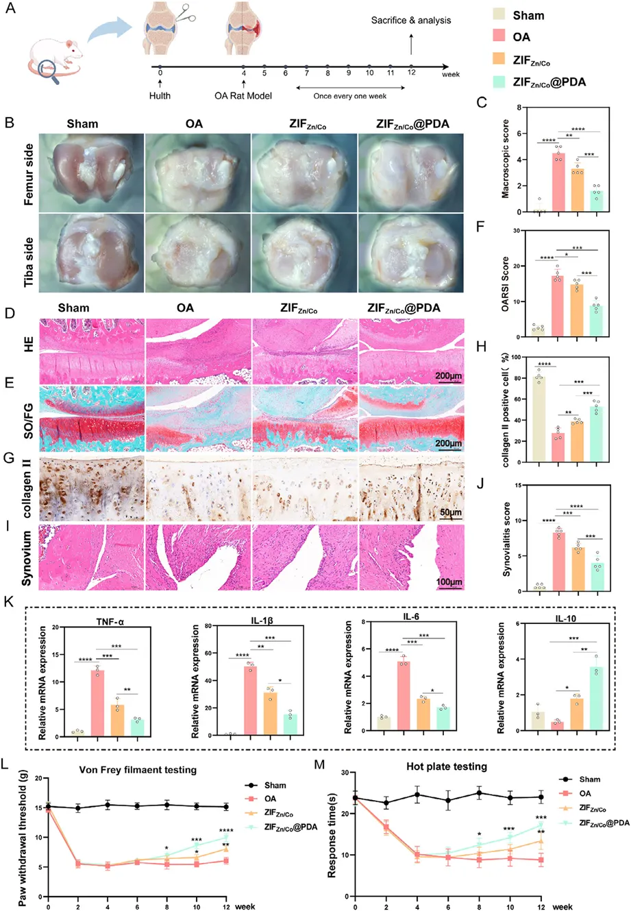 Figure 8:ZIFZn/Co@PDA在体内治疗骨关节炎的效果,包括动物实验设计、软骨修复、滑膜炎抑制及疼痛行为学评估。