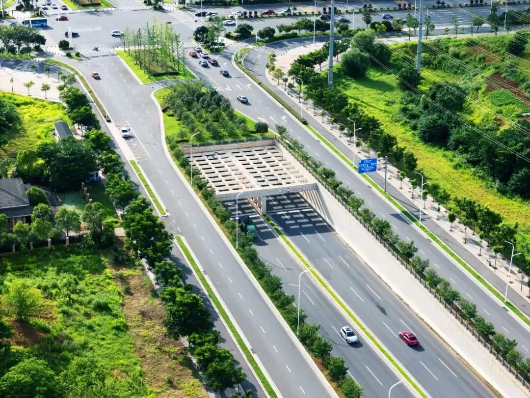 以生态优先为原则,将海绵城市、资源集约理念贯穿全周期。全线复用现状乔木、管网及路灯,减少拆改浪费;边坡采用喷播植草防治水土流失,构建7米中央分隔带+两侧绿化双层绿廊;落实海绵城市要求,布设透水铺装与雨水复用管网,采用智慧节能路灯,河塘段专项治水、路基就地取材,打造低碳生态道路。