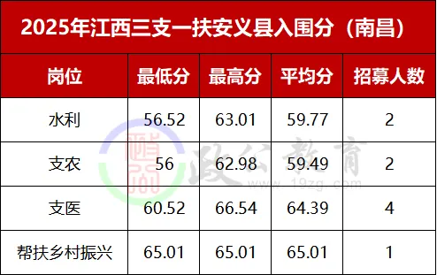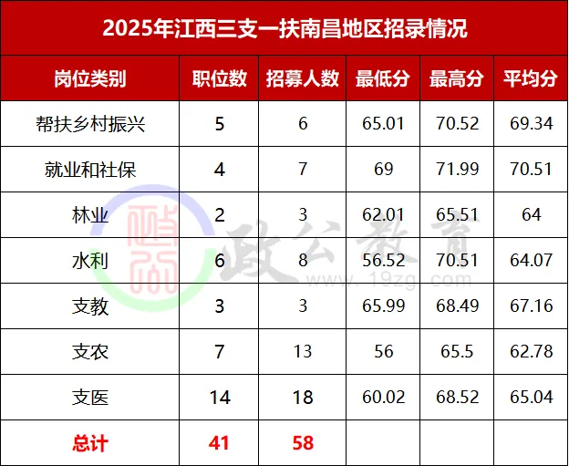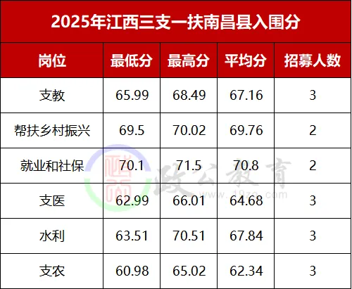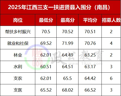 2025年南昌三支一扶共41个岗位,招录58人。覆盖支农、支医、支教、水利、帮扶乡村振兴、就业和社保、林业等 7 大岗位类别。不同区县、不同岗位间分数差异显著。其中上岸最低分56分,安义县支农岗位;上岸最高分71.99分 ,进贤县就业和社保岗位;平均分65.56分。