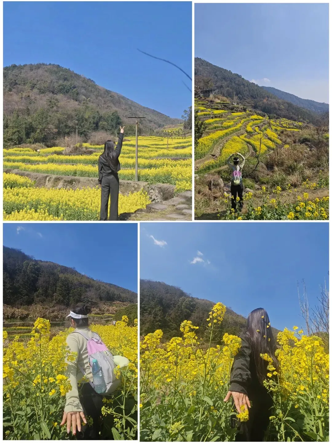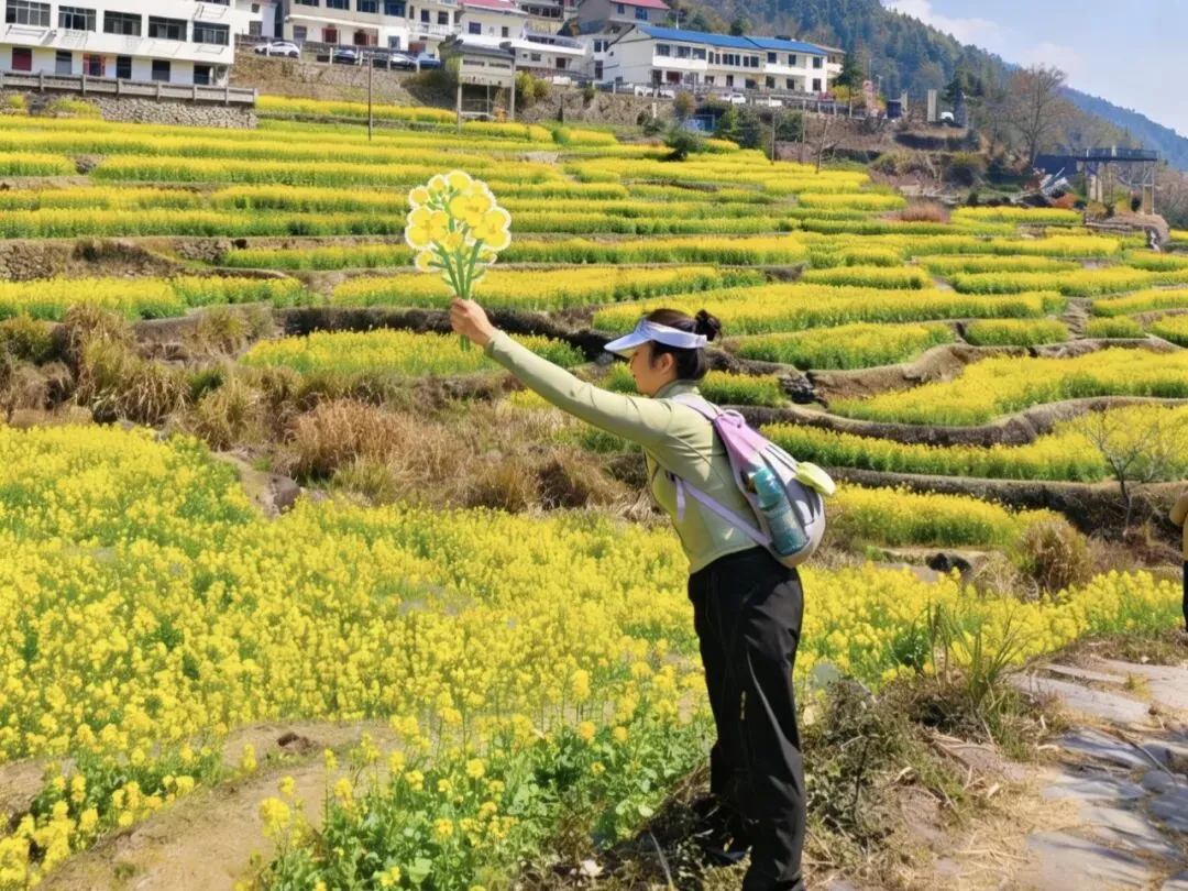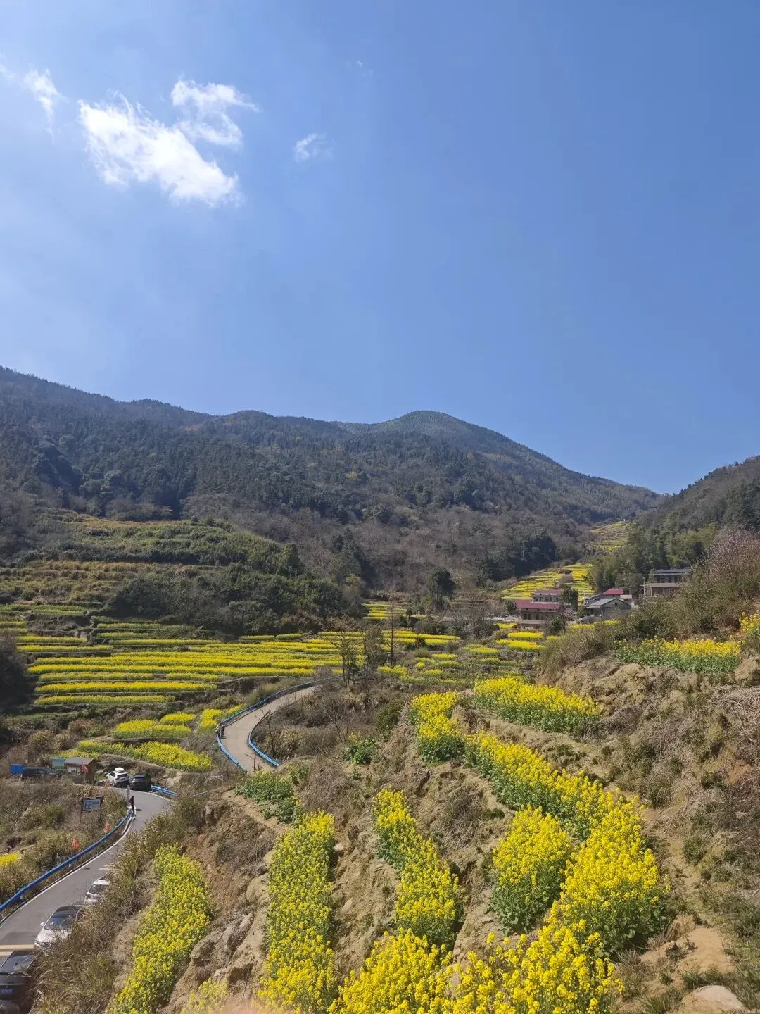 一路上就能看到小片的油菜花,站在梯田最底层往上望,才发现什么叫“开满了”。一层一层叠到山顶,像春天自己搭的台阶。