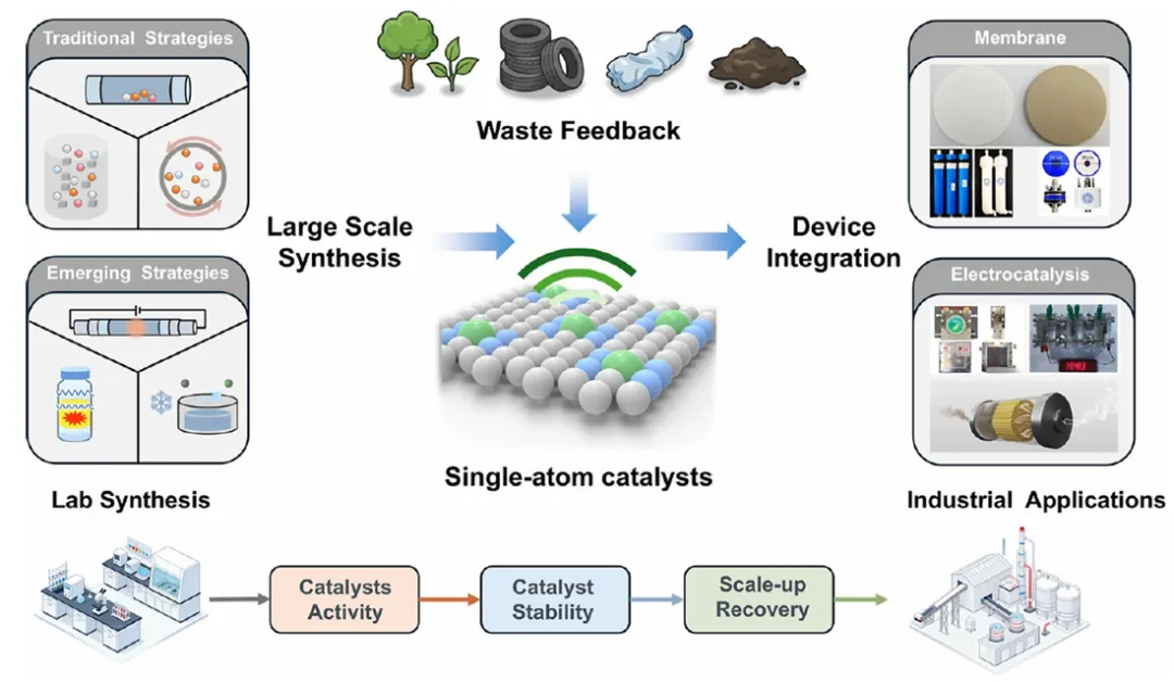 图1:SACs从实验室合成到实际应用的路线图:明确了SACs工业化的核心链路为“实验室合成→规模化制备(传统+新兴策略)→绿色原料提取及回收→器件集成(膜、电催化器件)→工业应用”,直观展现了各环节的核心关联与关键目标。