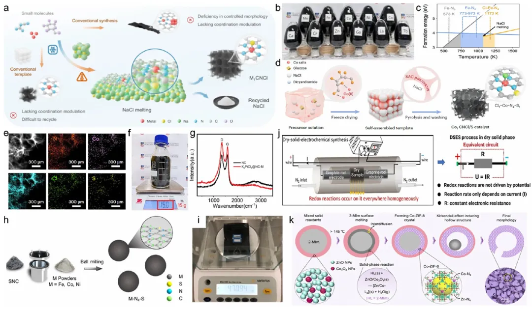 图2-3:传统规模化合成策略机制图:解析了热解、熔盐模板、球磨三种传统方法的核心合成机制。热解法通过前驱体设计与配位工程构建稳定M-NX键,实现了1.6 kg级Ni-SACs的单次制备;熔盐模板法利用NaCl等盐的相转变效应调控金属中心配位环境,可合成25种不同金属的SACs及高熵单原子催化剂;球磨法通过机械力诱导体相金属原子剥离,实现了4.7 g级Co-SNC的快速合成,三种方法均实现了克/千克级制备,为工业化奠定了材料基础。