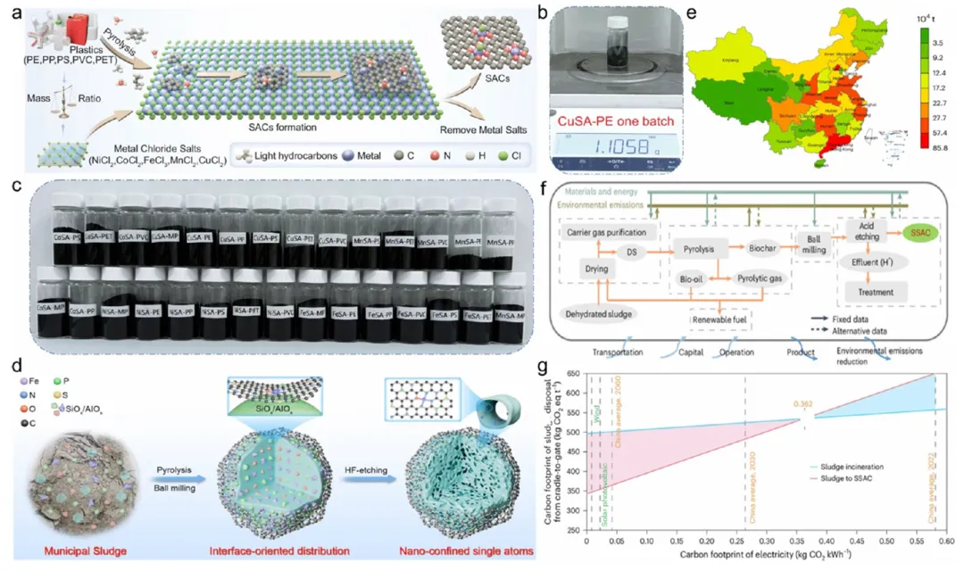 图7:废弃物基SACs合成图:展示了以塑料、污泥为原料的绿色合成工艺,利用熔盐模板法将聚乙烯、聚丙烯等废塑料转化为SACs,碳转化率达88%,将市政污泥转化为Fe-N3O单原子催化剂,生命周期评估显示该路径较传统污泥焚烧大幅降低环境影响,实现了环境与经济双重效益。