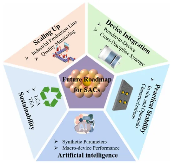 2. 发展适用于大规模集成的器件策略:推动SACs合成与器件制造的一体化,设计多级孔电极、柔性膜等结构以优化传质与导电。