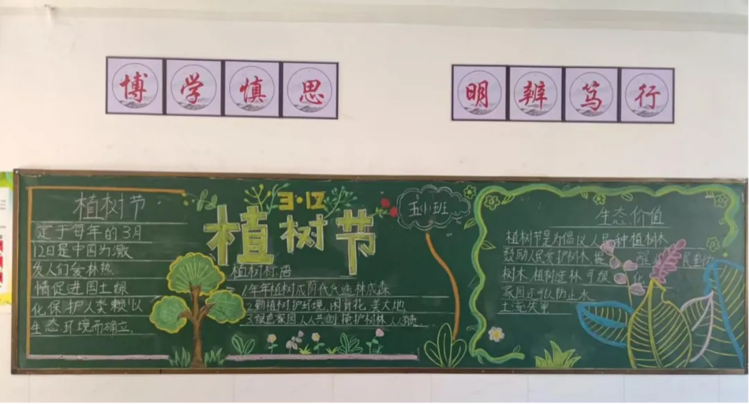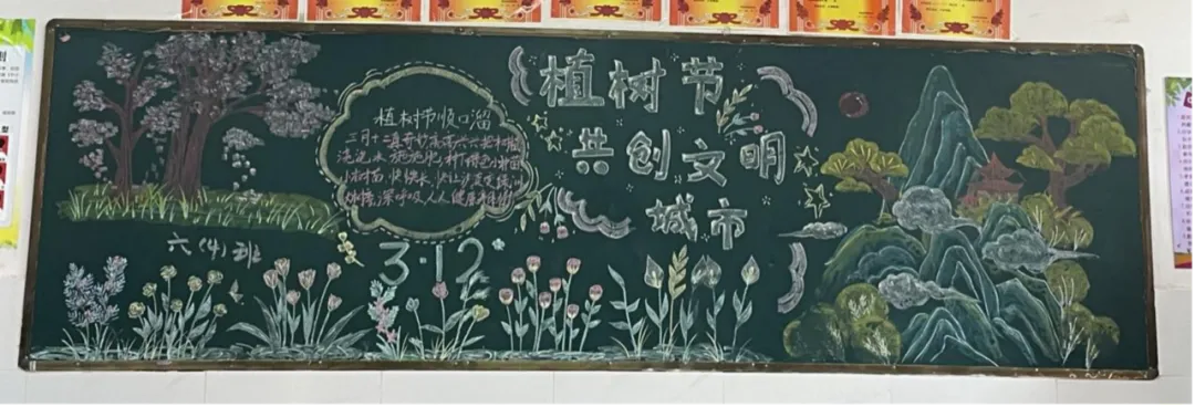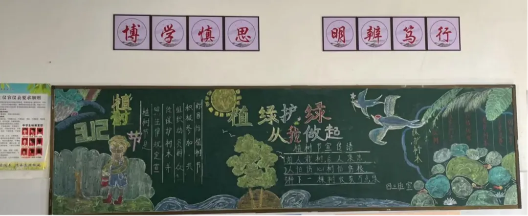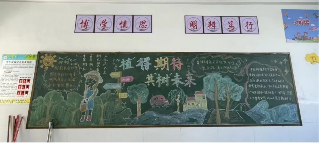 教室里,一场以“植树节”为主题的黑板报创作活动同步开展。同学们充分发挥想象力和创造力,以绿色为主色调,将植树知识、环保理念、美好心愿融入笔墨之间。同学们精心绘制挺拔的树木、嫩绿的枝叶,勾勒出春天的生机;有的同学认真书写植树节的由来、植树的意义,普及环保知识。