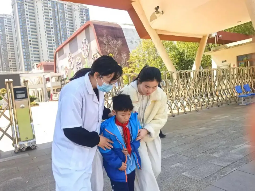 校医李尧尧接到报告后迅速到达三(8)班查看疑似食物中毒学生情况,了解大致情况后班主任随校医一同将学生送至校医务室进行初步诊断,并做好信息登记。