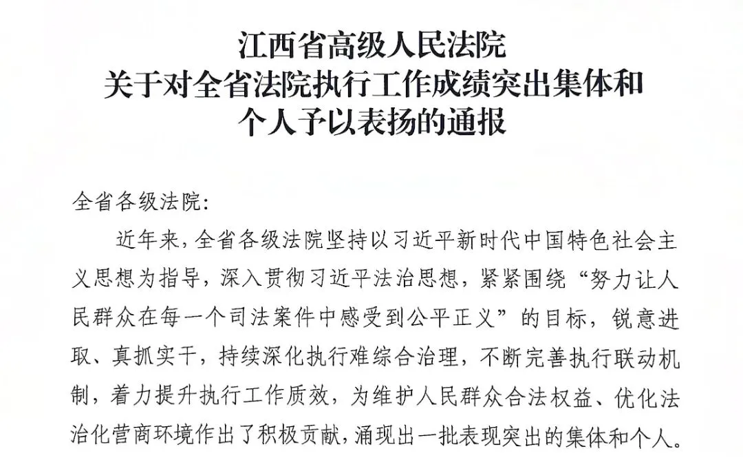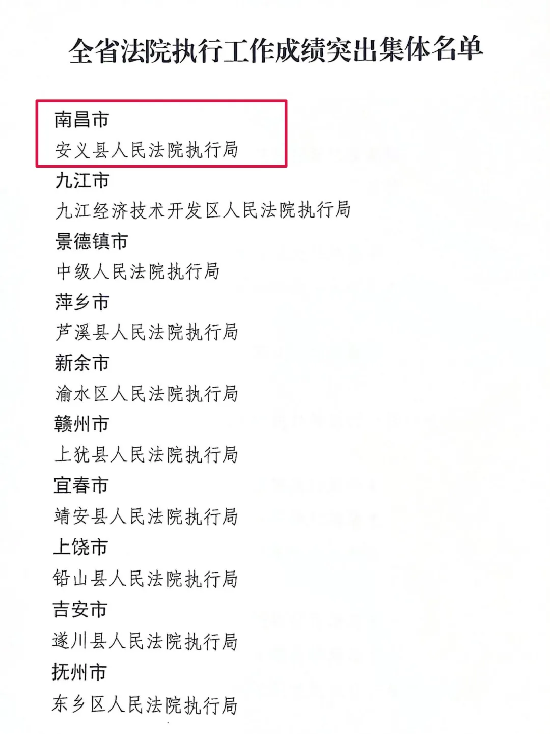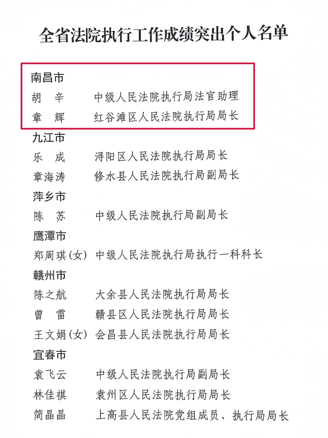近日,江西省高级人民法院印发了《关于对全省法院执行工作成绩突出集体和个人予以表扬的通报》。为鼓舞干劲、激励队伍,进一步营造履职尽责、担当实干的良好氛围,省高级人民法院决定,对10个集体、20名个人予以通报表扬。其中,安义县法院执行局荣获全省法院执行工作成绩突出集体,南昌市中级人民法院执行局法官助理胡辛、红谷滩区法院执行局局长章辉荣获全省法院执行工作成绩突出个人。