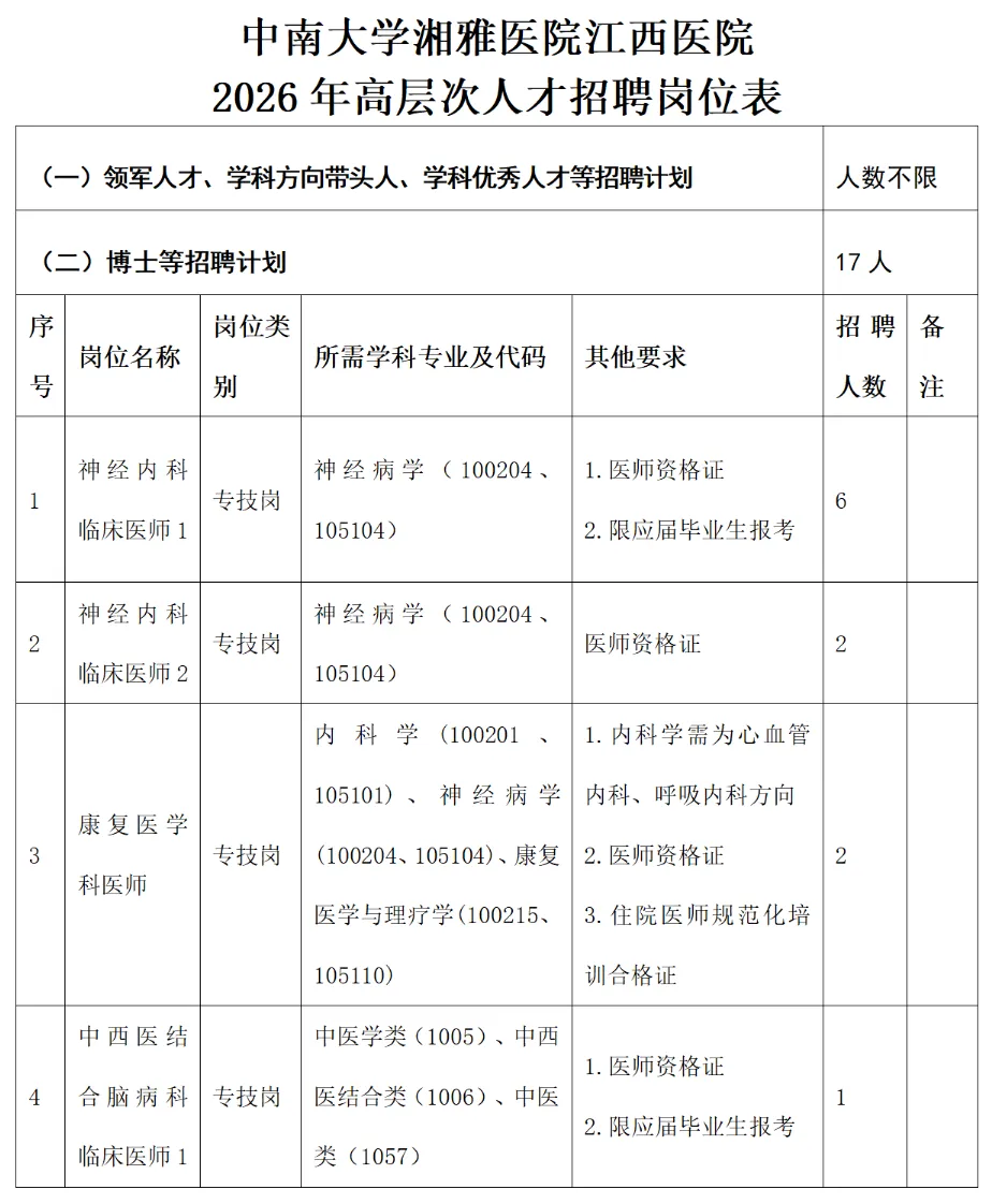 领军人才、学科方向带头人、学科优秀人才等招聘人数不限,博士等招聘计划共17名,具体招聘岗位及要求详见《中南大学湘雅医院江西医院2026年高层次人才招聘岗位表》(附件1,以下简称《岗位表》)。