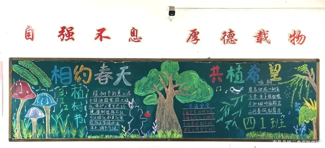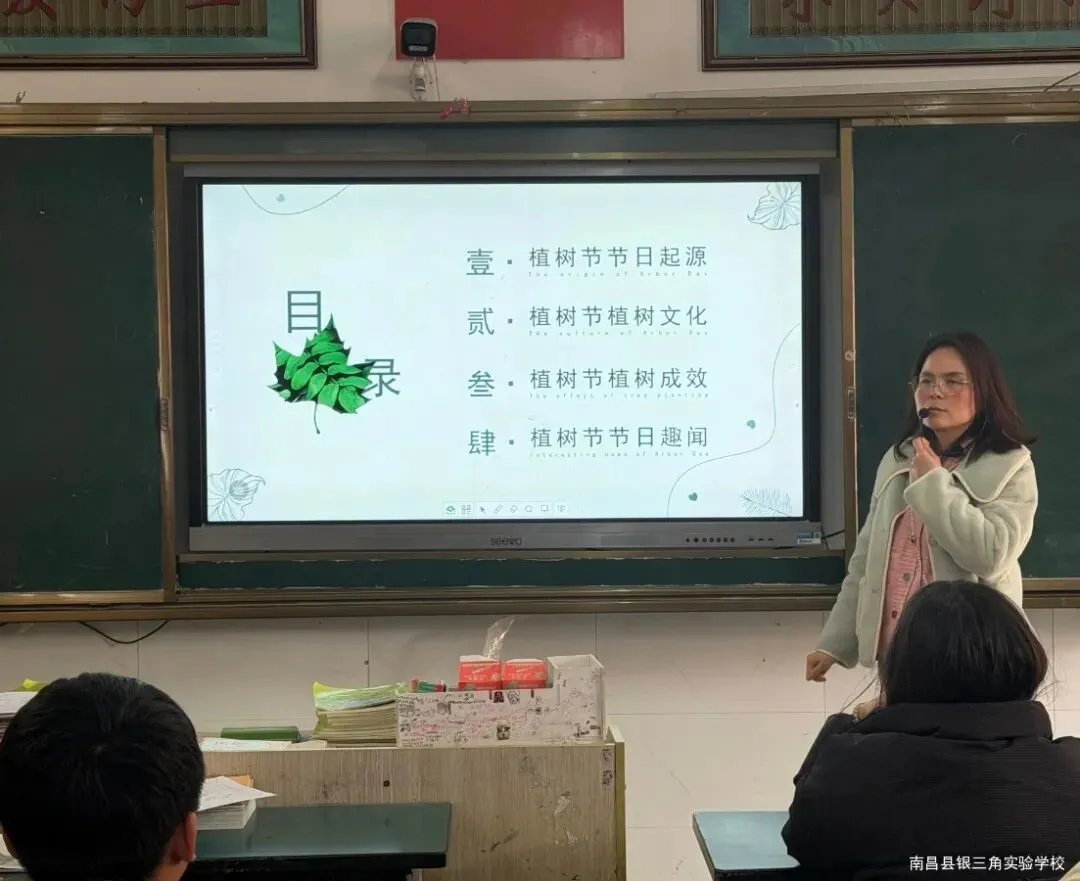 教师在班会中讲解植树节起源与意义,结合黑板报内容引导学生理解环保重要性。课堂上,老师通过图文结合的方式,让学生了解树木对生态环境的作用,以及植树节的历史背景。