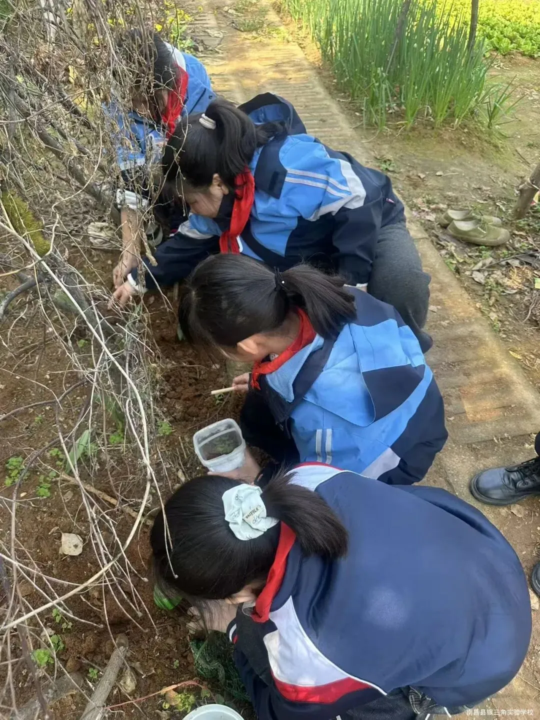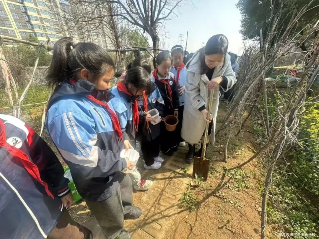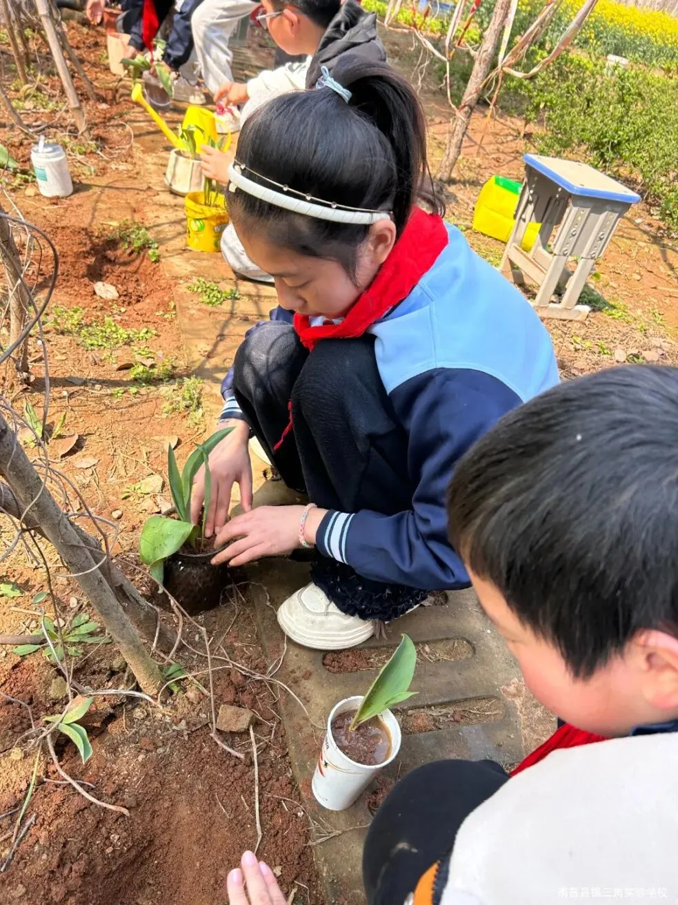 活动中,老师带领学生们在校园实践区开展种植实践。大家分工合作,有的负责郁金香移植,小心地将植株从原土中取出,移栽到新的花盆。学生们在户外俯身观察植物的生长状态,感受种植的每一个细节。