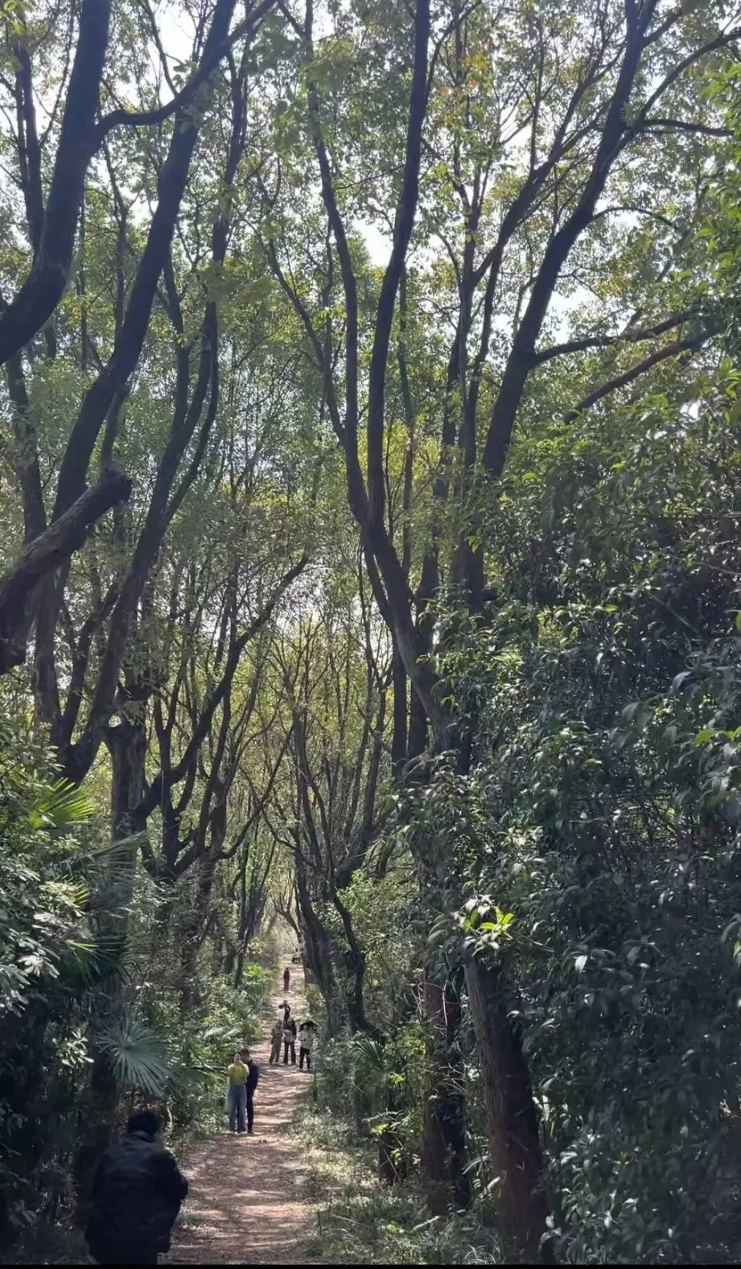 踏入园区,广场两侧的草坡上矗立着巨型石雕傩像,两侧各有10尊,气势恢宏。记者循着线索来到石像后方的林间小路,只见这里早已挤满了前来拍照游玩的游客。多名游客向记者表示,他们都是南昌本地人,通过网上的短视频了解到这个打卡点,不少人也是第一次走进傩园;还有部分游客坦言,此前曾来过傩园,但从未发现石像后方藏着这样一条静谧小径,刷到“绿野仙踪”的相关视频后,特意专程前来探访。