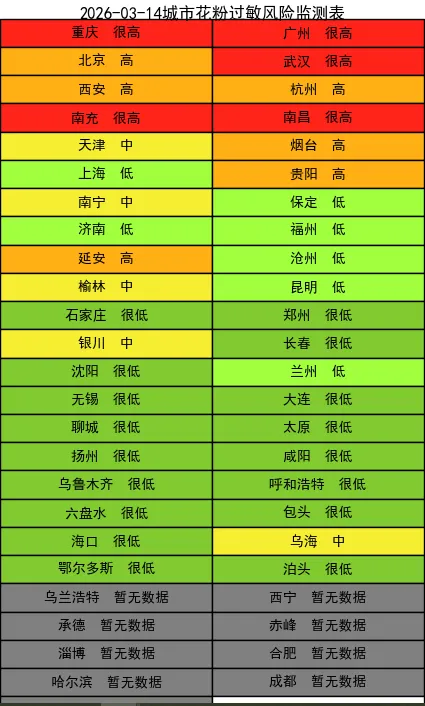 重庆、广州、武汉、南充、南昌花粉过敏风险很高! 北京、西安、杭州、烟台、贵阳、延安花粉过敏风险高! 3月14日花粉过敏指数播报