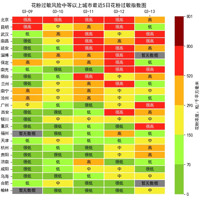 最近5日花粉浓度过敏风险中等以上的城市列表: