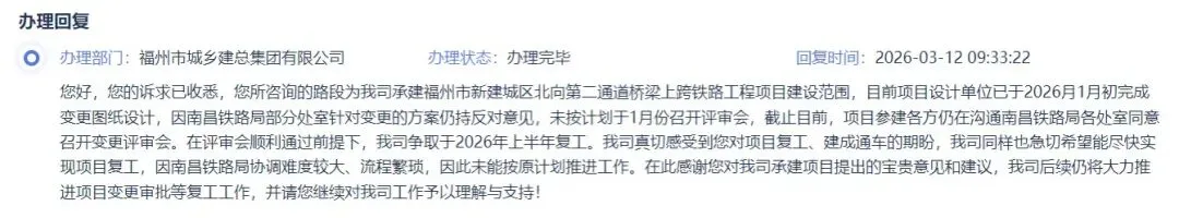 福州市城乡建总集团于2026年3月12日正式回复市民诉求,原文如下:您所咨询的路段为我司承建福州市新建城区北向第二通道桥梁上跨铁路工程项目建设范围,目前项目设计单位已于2026年1月初完成变更图纸设计,因南昌铁路局部分处室针对变更的方案仍持反对意见,未按计划于1月份召开评审会,截止目前,项目参建各方仍在沟通南昌铁路局各处室同意召开变更评审会。在评审会顺利通过前提下,我司争取于2026年上半年复工。我司真切感受到您对项目复工、建成通车的期盼,我司同样也急切希望能尽快实现项目复工,因南昌铁路局协调难度较大、流程繁琐,因此未能按原计划推进工作。