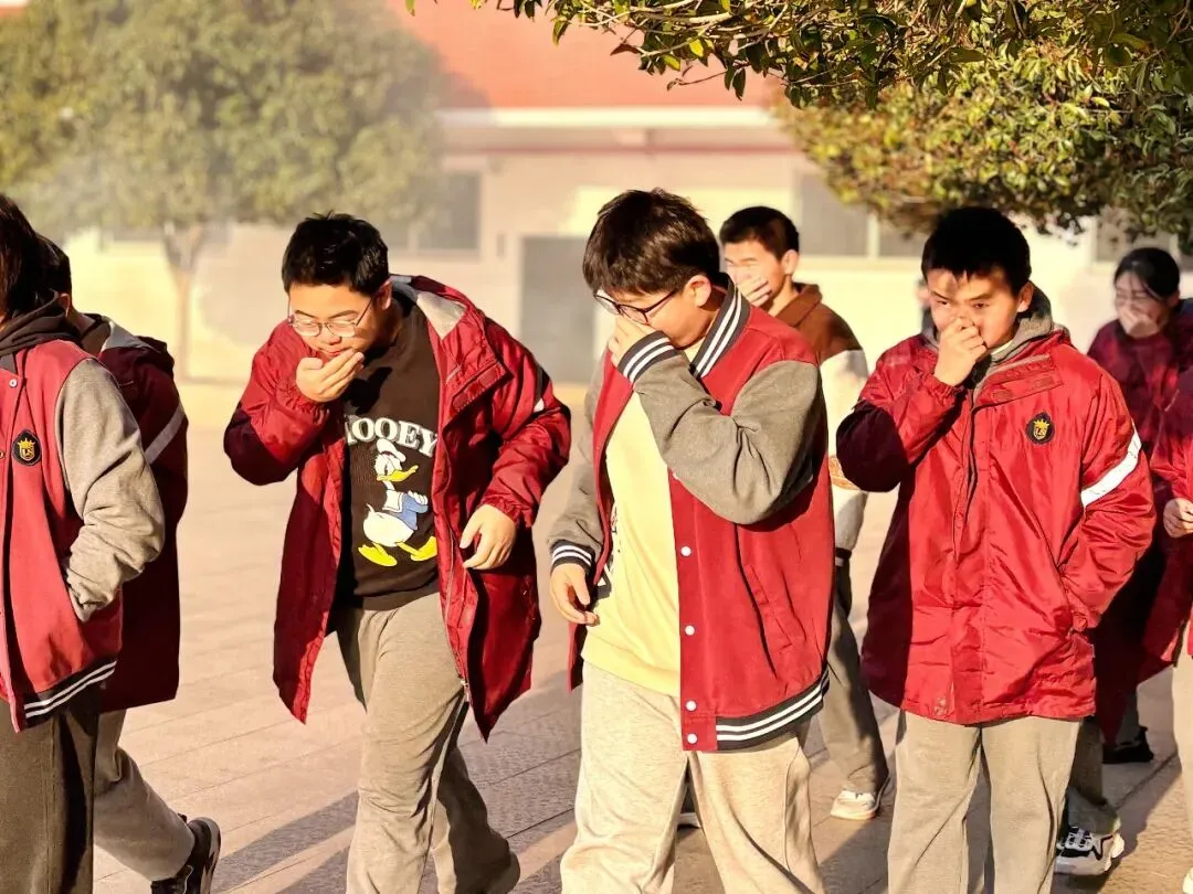 随着警报声响起,消防应急疏散演练正式开始。政教处老师第一时间抵达主楼梯口吹响口哨,引导疏散。撤离过程中,学生们严格按照 “分楼层依次下楼、顶楼优先、二楼先行、三楼随后” 的疏散顺序,及时排查突发情况,杜绝拥挤、踩踏等安全隐患,确保每一名学生都能安全、快速撤离。