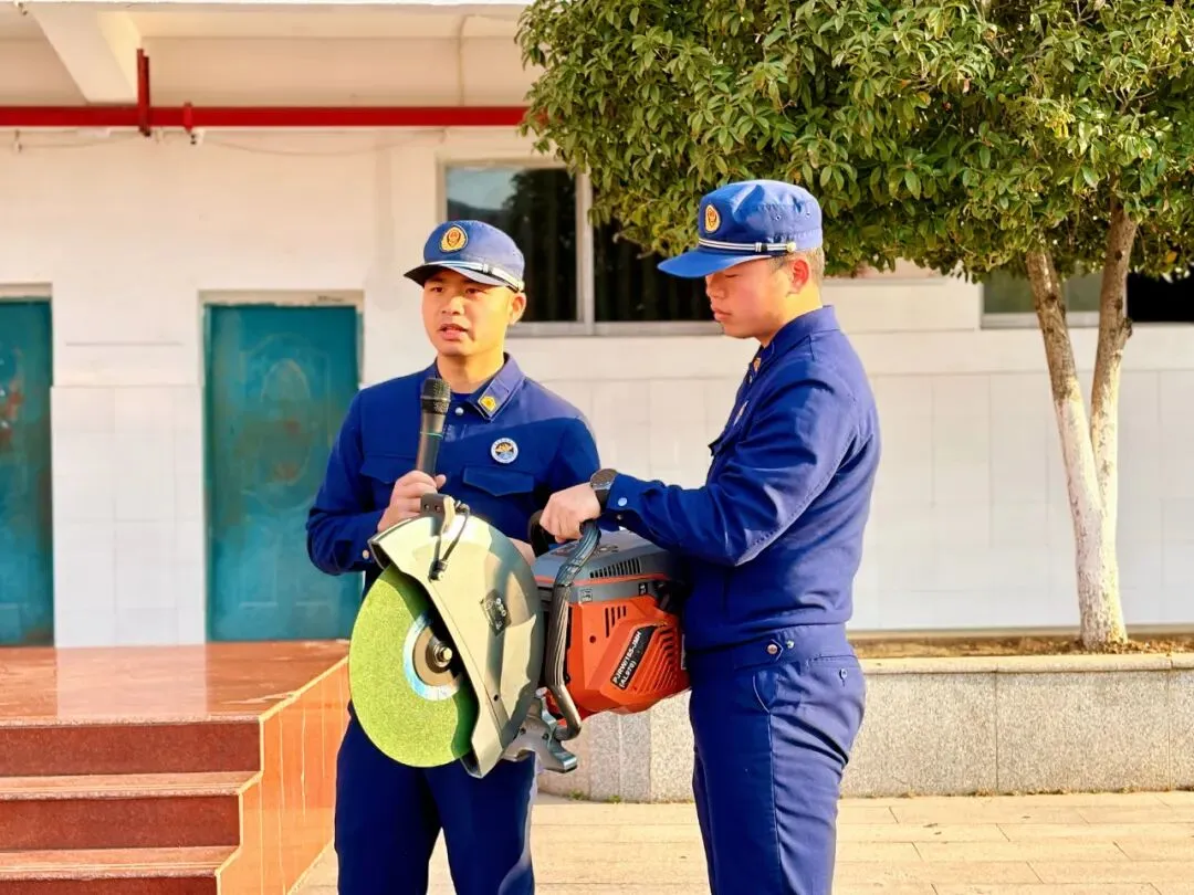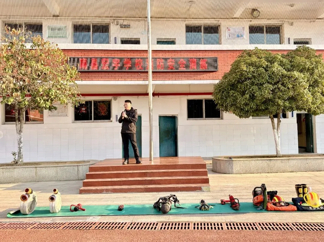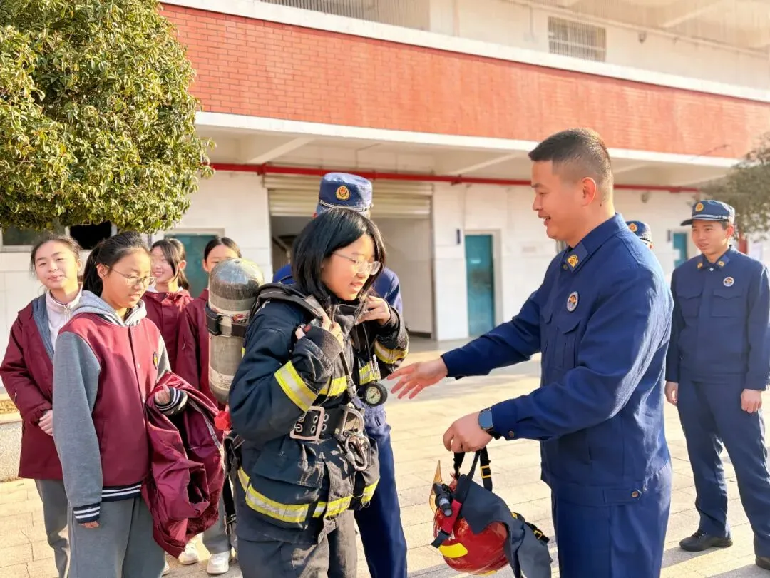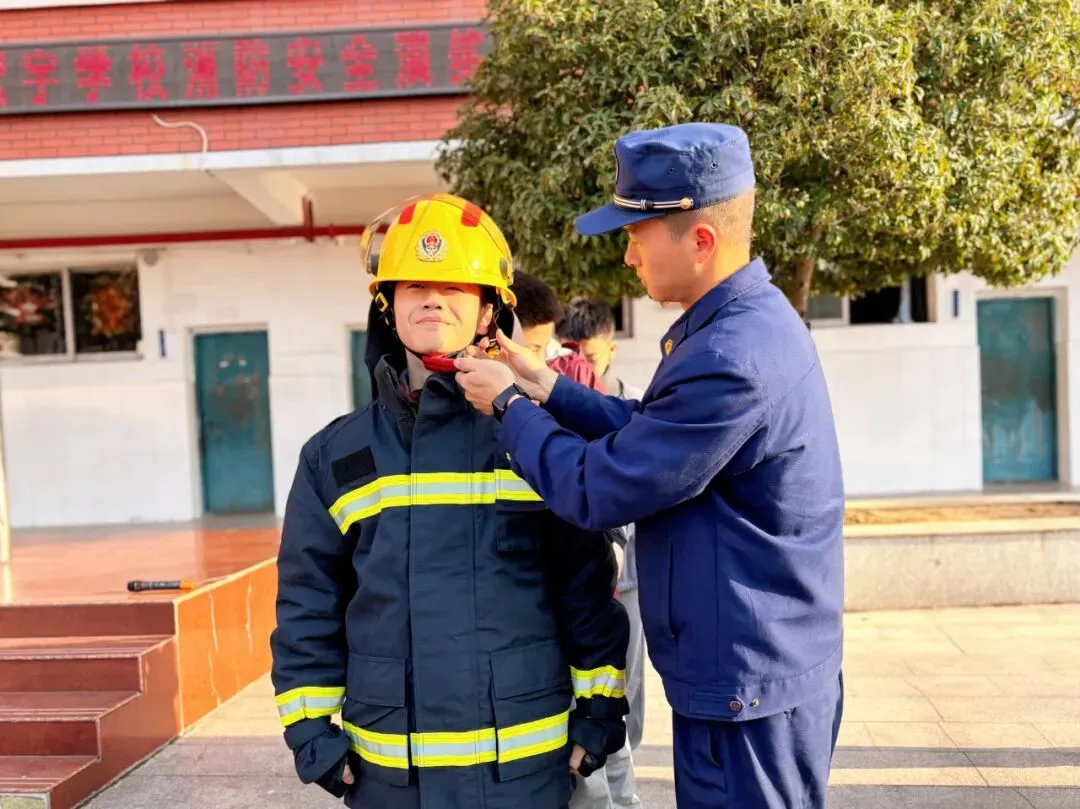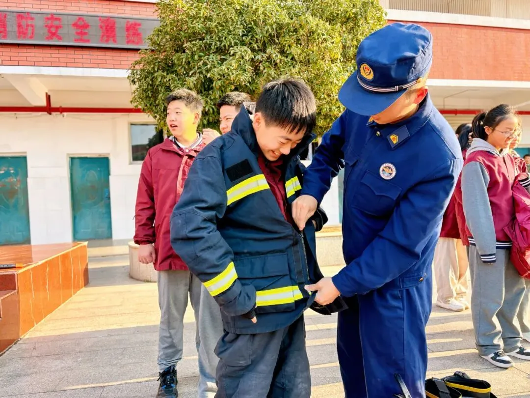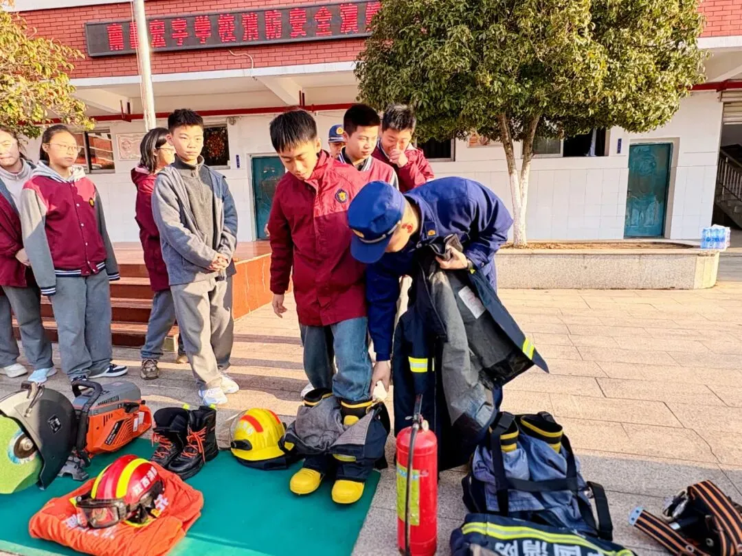 随后,消防员为大家细致讲解摆成一排的各类救火专业道具,从高压水枪、救援绳索到破拆工具、空气呼吸器逐一介绍,用通俗易懂的语言讲解每样装备的用途与操作原理,让同学们大开眼界,对消防工作有了更直观的认知;消防员还邀请同学们上台试穿消防服,亲身体验消防员的工作状态。