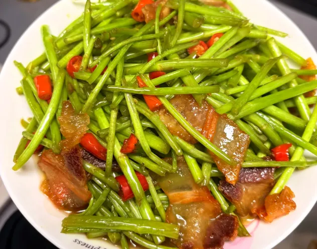 我偏爱一道“藜蒿炒腊肉”。做法不复杂,腊肉先小火煸出油,再下蒜末和辣椒提香,藜蒿最后入锅,快炒到刚断生就起锅。藜蒿的清苦一碰腊肉的咸香,嘴里立刻变得干净,人也不容易腻。
