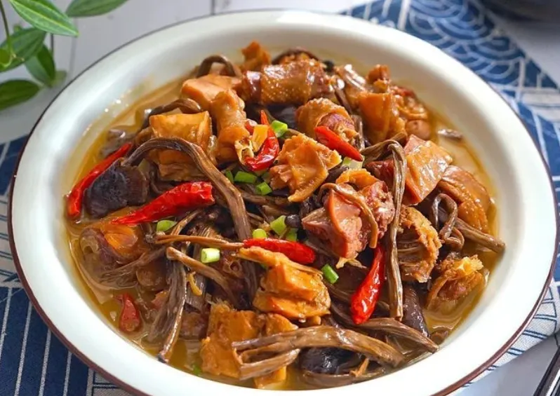 茶树菇炖鸡的做法不复杂。干茶树菇先温水泡发,挤干水分去根,鸡块焯水后下锅。姜片一把,小火慢炖到汤色变清亮,再加盐收口。不是猛加料,而是靠时间把鲜味慢慢炖出来。