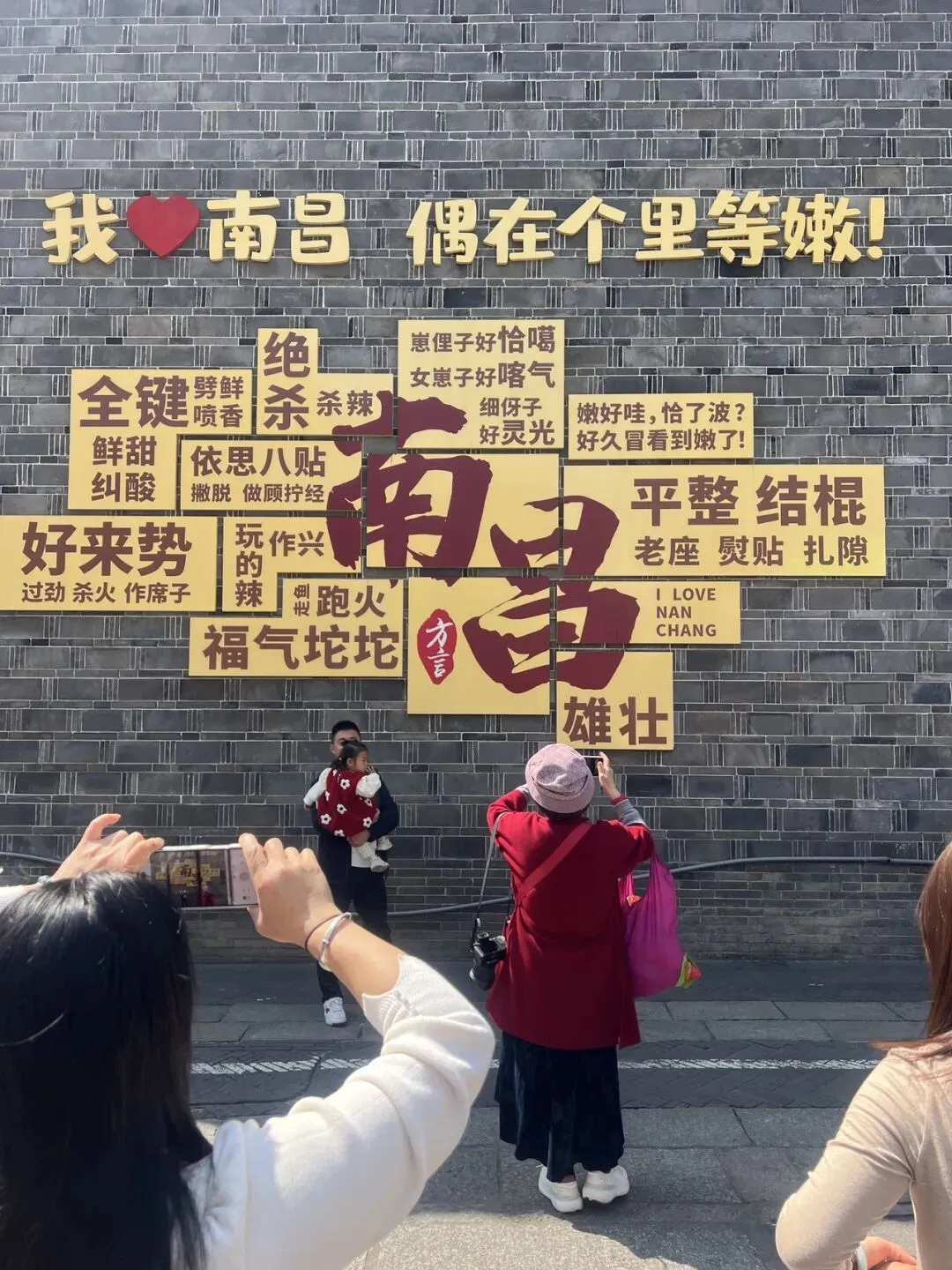 街口那面南昌方言墙太戳人了,“偶在个里等嫩”“绝杀杀辣”“福气坨坨”,满满的南昌腔调,路过的人都忍不住停下拍照打卡。