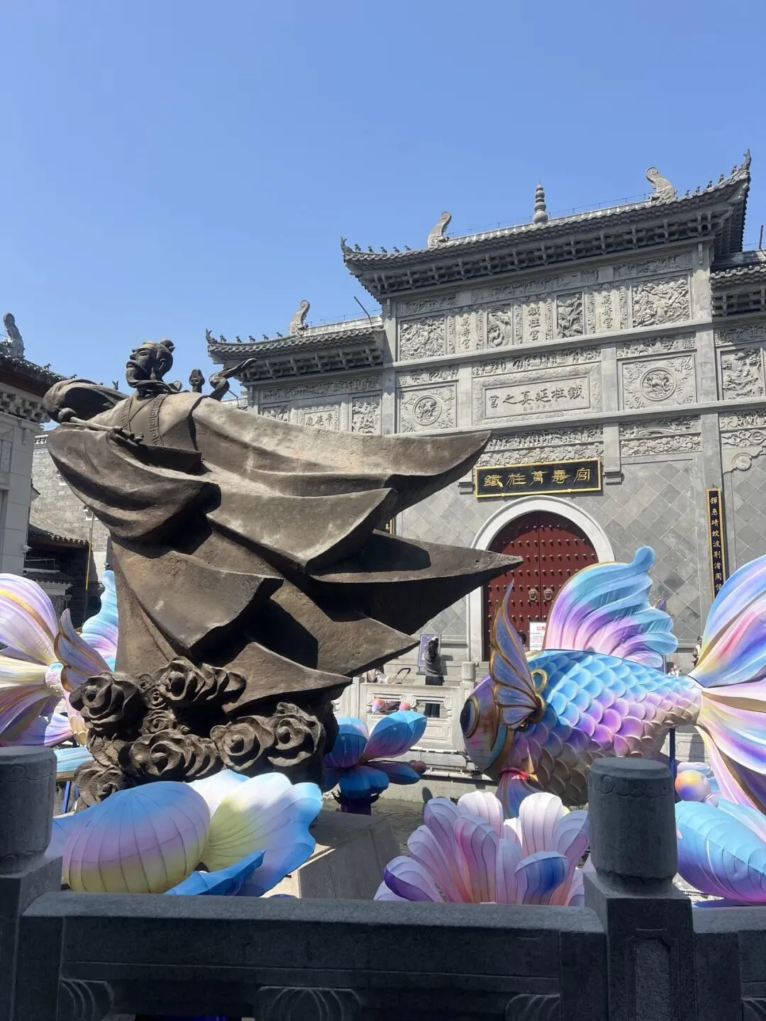往里走,许真君的雕像气势恢宏,衣袂翻飞栩栩如生,旁边点缀着梦幻的鱼灯、莲花灯,古韵与新潮完美融合。