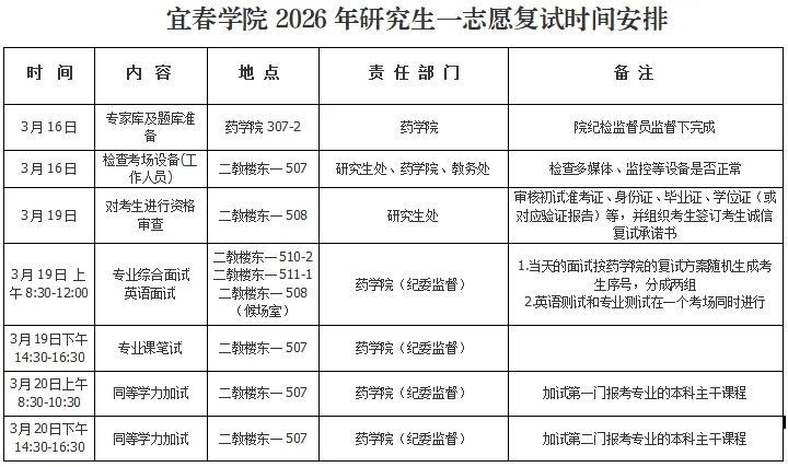 1.复试时间和地点:一志愿考生复试时间在3月19—20日,复试地点在宜春学院校本部(宜春市袁州区学府路576号)具体安排详见《宜春学院2026年硕士研究生一志愿复试时间地点安排表》。