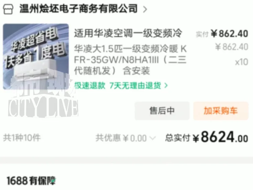 魏先生告诉记者,自己购买的空调在其它平台的价格是每台1100元左右,但在阿里巴巴1688平台,他最终以总价8624元下单了10台空调,也就是每台价格为862.4元。