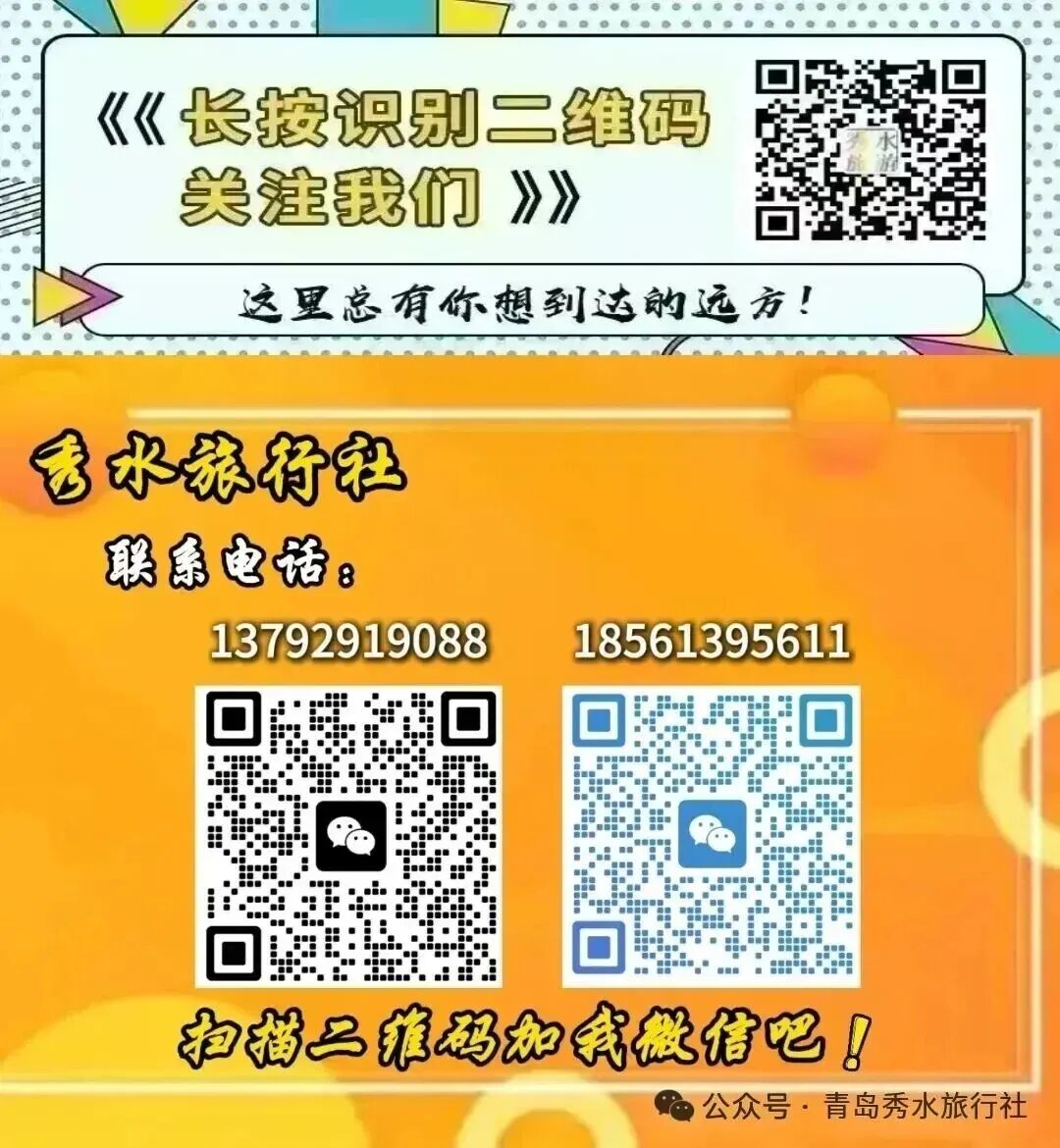 免责声明:部分文章和图片来源网络,其原创性以及文中陈述的文字和内容未经本公司核实,对文章以及全部或部分内容、文字、图片的真实性、完整性、及时性本公司不作任何保证和承诺,请读者自行参考并核实。部分文章和图片的原始作者或版权所有人如有异议,请联系本公司删除。宣传和广告内容不构成青岛秀水旅行社有限公司要约邀请或承诺,青岛秀水旅行社有限公司在中国法律许可范围内有权作出调整而不另行通知。产品具体内容以最终签署合同时为准。