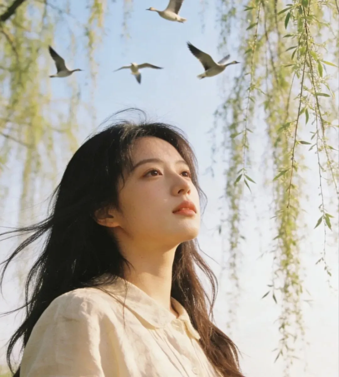 日暖枝柔黄雀啭,祥云燕影绕楼台。