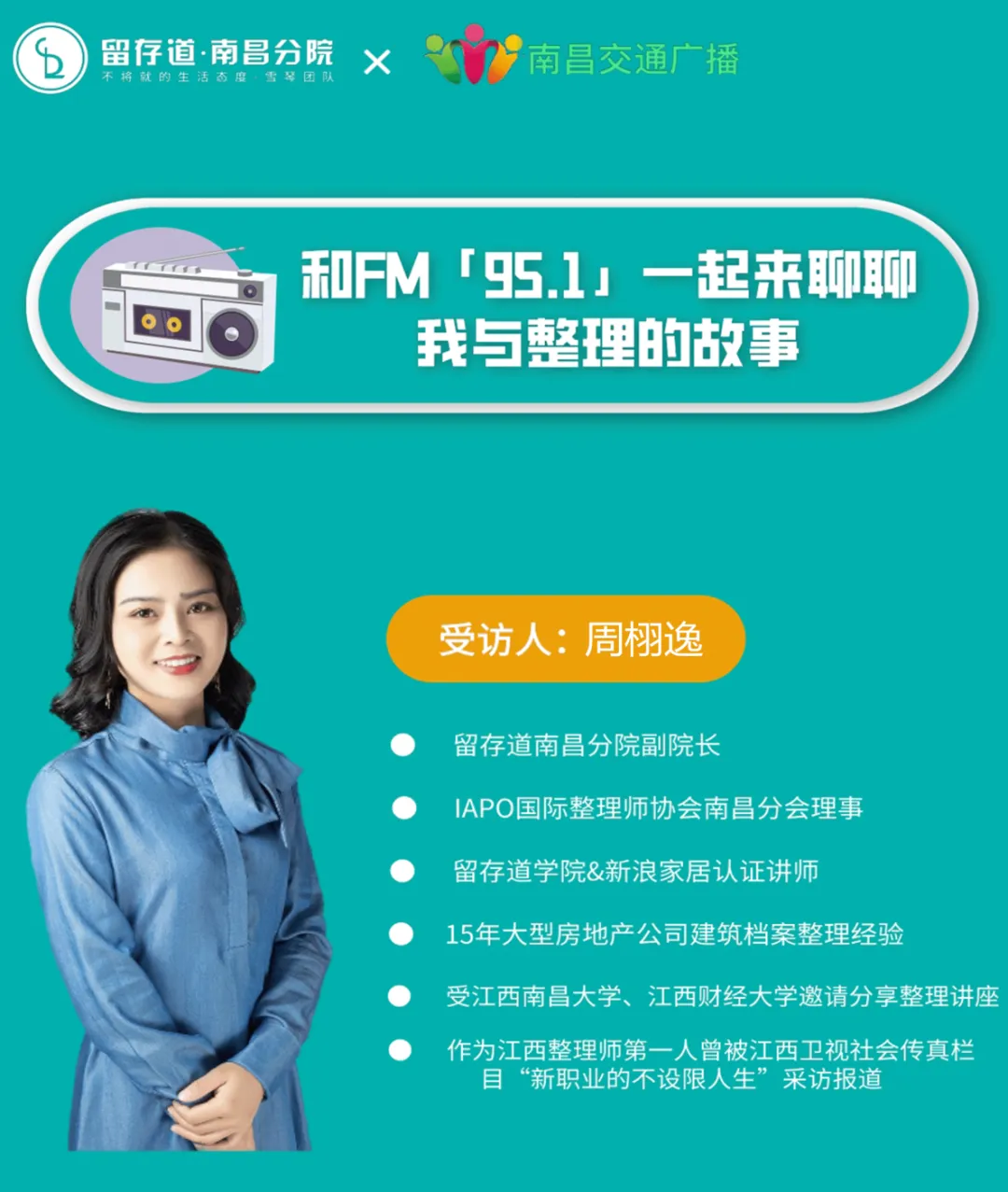 2020年8月20日,留存道南昌分院副院长周栩逸,受邀走进南昌交通广播FM95.1《家住南昌》直播间,与主持人紫轩一起,用一场超7.2万人次观看的直播,为大家揭开了整理收纳行业的神秘面纱。