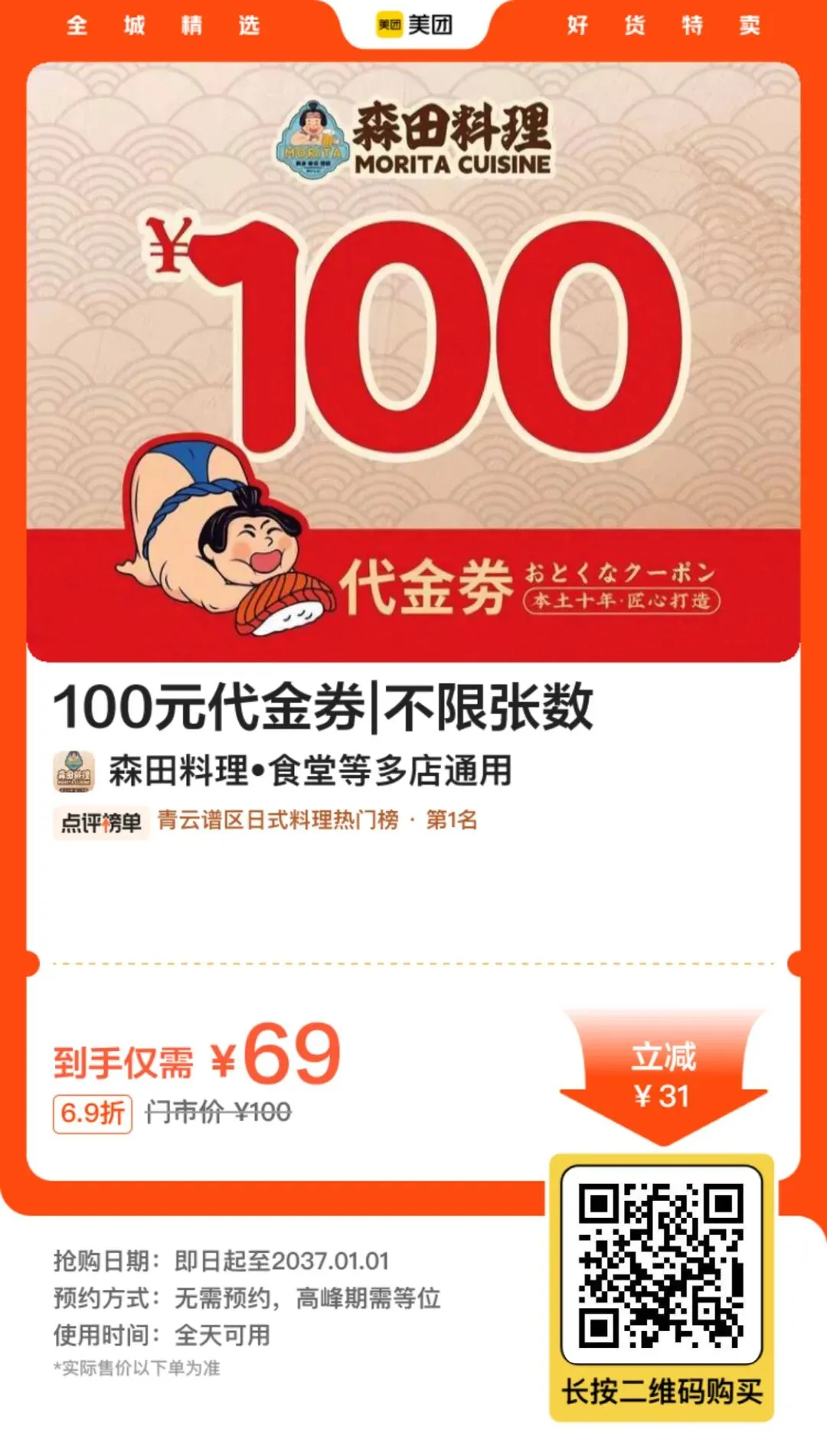 南昌「森田料理·食堂」优惠券:69抵100可叠加