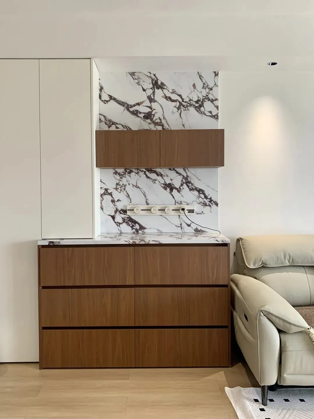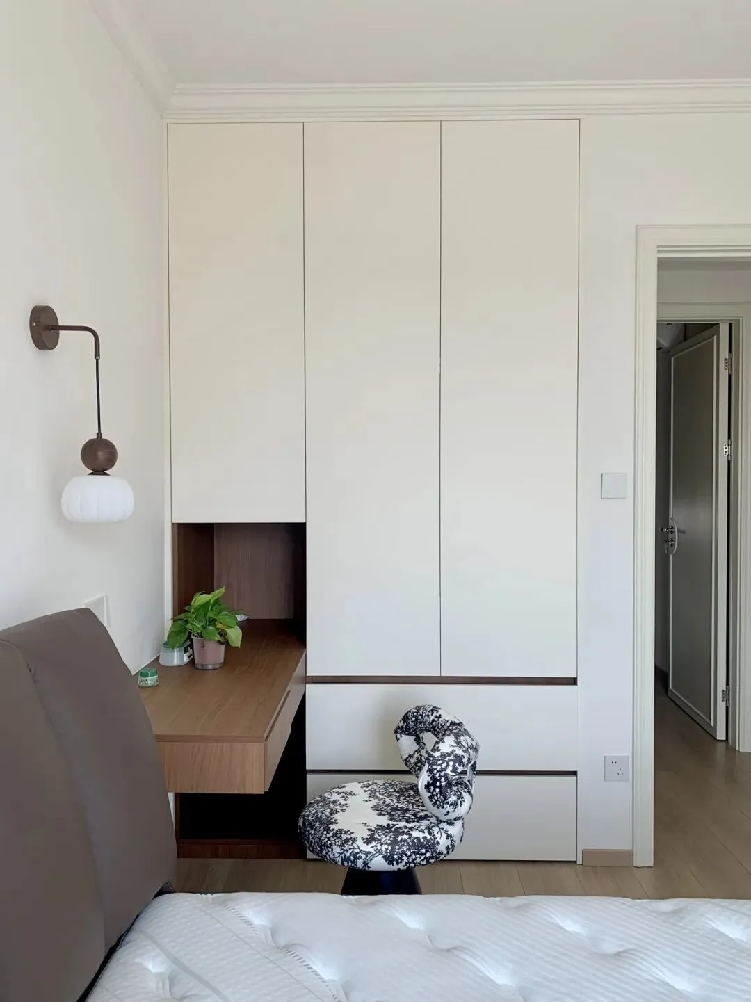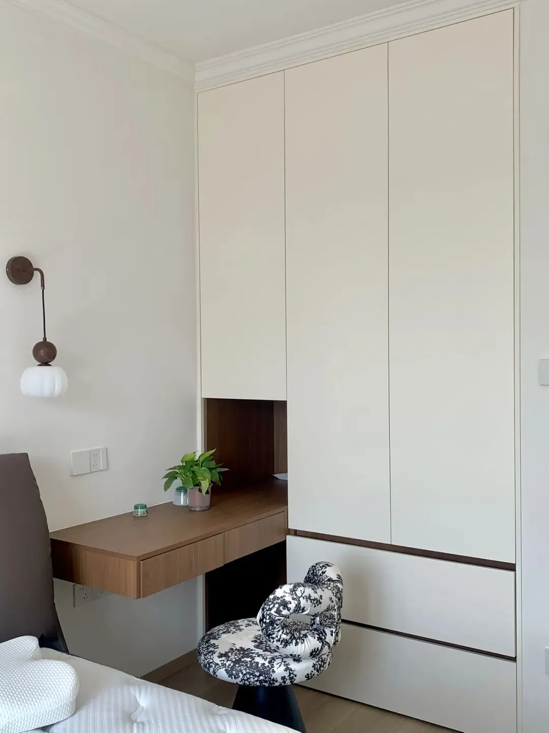 衣柜与梳妆台的一体化设计,是这个空间最贴心的巧思。用深沉的胡桃木台面打破了纯白的单调,不占地面空间的设计,让卧室动线更流畅。