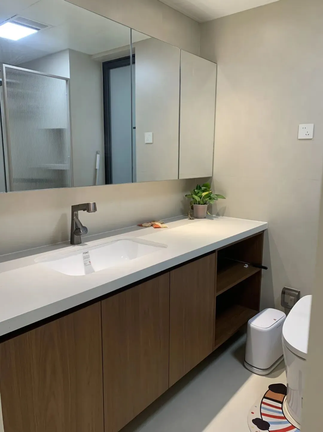 卫生间作为日常高频使用的功能区,我们摒弃了繁杂的装饰,日常洗漱也能成为放松身心的治愈时刻。整体空间以浅色柔光砖通铺,温润的质感弱化了瓷砖的冰冷感,让小空间更显通透整洁,也和全屋的奶油风完美呼应。不想让瓷砖阳角显得廉价又尖锐,我们决定做海棠角工艺。把两块瓷砖的拼接边缘各打磨成45°斜面,拼出圆润钝角,再用美缝填满缝隙。让瓷砖过渡自然又顺滑,没有突兀的收边条,也不怕磕碰崩边。