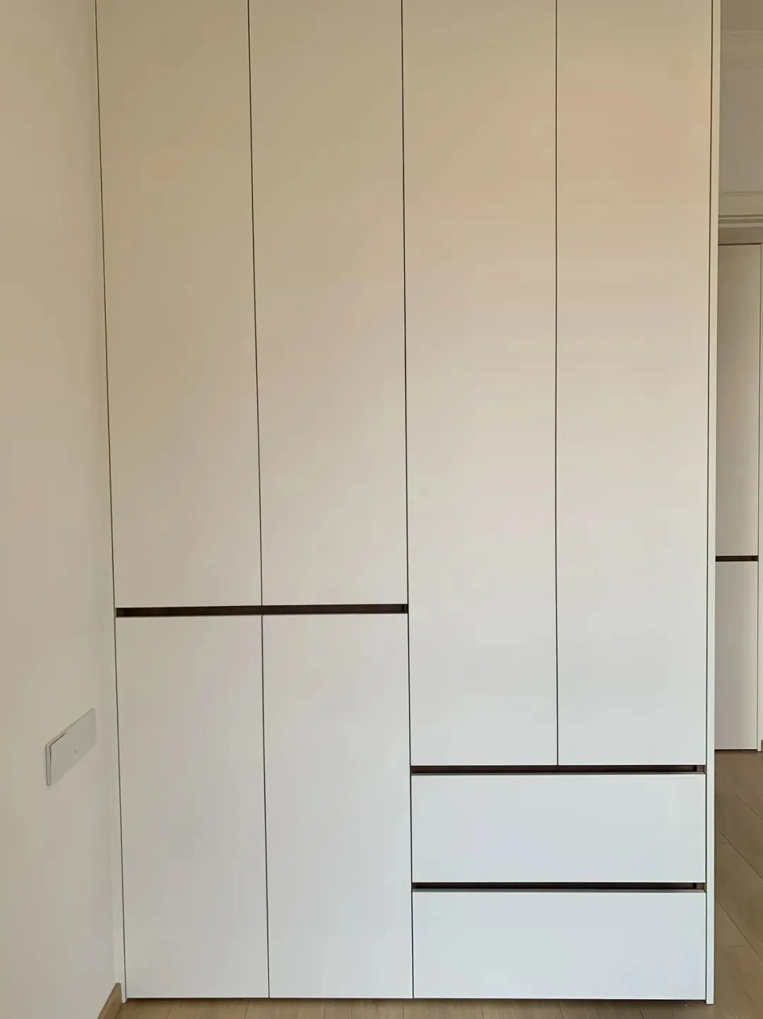 针对次卧的收纳需求,我们定制了一门到顶的极简衣柜。和墙面融为一体,没有多余的装饰,弱化了柜体的厚重感。落地效果05- 主卧|实景图