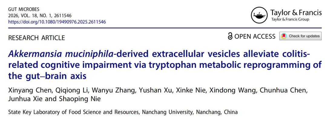 炎症性肠道疾病(IBD),尤其是溃疡性结肠炎(UC),其疾病的临床表现已超出胃肠道范围。现有大量临床数据表明,UC患者是认知功能障碍和痴呆加速进展的高风险人群。肠道炎症与神经功能衰退之间的双向关联,被普遍归因于肠-脑轴的失调:肠道菌群紊乱(生态失调)可破坏肠道屏障,引发全身性炎症,并最终导致神经炎症。恢复微生物稳态是潜在治疗策略。其中,细菌胞外囊泡(bEVs)作为一种由细菌分泌的纳米级脂质双层结构,作为宿主-微生物通讯的关键媒介,能穿越血脑屏障,调节神经免疫反应。被认为是介导宿主-微生物对话的关键信使。与活菌相比,bEVs具有稳定性高、可穿越生物屏障、靶向递送且无增殖风险等独特优势。IBD相关的认知功能障碍涉及血脑屏障破坏、胶质细胞活化和色氨酸代谢紊乱等多个环节,而这些都可能被EVs所携带的活性物质调节。尽管阿克曼氏菌(A. muciniphila)及其胞外囊泡(AmEVs)在改善结肠炎方面显示出潜力,但其能否以及如何缓解结肠炎伴随的认知缺陷,此前尚未被探索。后续是否可以将AmEVs作为一种多靶点治疗工具,能否有效连接肠道微生态与神经免疫稳态,为IBD及其神经并发症提供新策略?针对以上科学问题,2026年1月6日,国家食品科学与资源重点实验室南昌大学聂少平教授团队在《GUT MICROBES》杂志(IF = 11.0)在线发表了题为“Akkermansia muciniphila-derived extracellular vesicles alleviate colitisrelated cognitive impairment via tryptophan metabolic reprogramming of the gut‒brain axis”的研究论文。