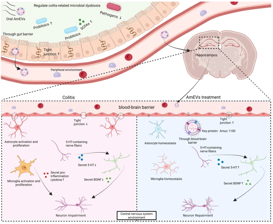 该研究系统阐明了嗜粘蛋白阿克曼氏菌来源的细菌细胞外囊泡(AmEVs)通过调控肠-脑轴,同时缓解结肠炎及其相关认知障碍的机制。(1)双重治疗效果:AmEVs能显著减轻DSS诱导的小鼠结肠炎症状(如体重下降、疾病活动指数升高),并有效逆转结肠炎引发的认知缺陷(空间和识别记忆缺陷)。(2)肠-脑屏障修复:AmEVs通过上调肠道和血脑屏障(BBB)的关键紧密连接蛋白(如Occludin, ZO-1)表达,修复受损的物理屏障,阻止炎症因子和细菌毒素入脑。(3)神经炎症抑制与神经修复:AmEVs通过抑制海马区小胶质细胞和星形胶质细胞的过度活化,降低促炎细胞因子表达水平,促进突触蛋白(SYP, PSD95)、神经元骨架蛋白(Map2)及神经营养因子(BDNF)的表达,修复神经元和突触功能。(4)色氨酸代谢重编程:这是核心机制。AmEVs对色氨酸代谢进行双向精准调控——在肠道抑制过量的5-HT产生,在海马则恢复5-HT水平及其受体(5-HT1A)表达。研究鉴定出AmEVs中的关键蛋白Amuc_1100,它能直接被神经元摄取,并通过TLR2信号通路促进5-HT合成。(5)肠道菌群与代谢物重塑:AmEVs干预可纠正菌群失调(如富集双歧杆菌、抑制致病菌),并恢复短链脂肪酸(SCFAs)等有益代谢物的水平,为整体抗炎和神经保护效应提供支持。(1)功能成分的贡献度未量化:尽管发现了Amuc_1100的关键作用,但AmEVs中其他蛋白质、核酸或脂质成分对整体疗效的具体贡献尚未明确。TLR2抑制剂仅能部分阻断AmEVs效应,提示存在其他并行机制。(2)因果关系证据链可加强:菌群变化与神经保护之间的因果关系尚未完全确立。例如,通过粪菌移植实验验证“AmEVs修饰后的菌群”是否足以产生神经保护作用,将更具说服力。文中多数机制关联基于相关性分析(如特定菌属与炎性因子的相关),需更多功能获得/丧失实验来证实。(3)神经通路未被探索:研究未考察迷走神经等直接神经通路是否参与了AmEVs的肠脑信号传导。切断迷走神经可能有助于区分神经与体液通路各自的贡献。(4)模型与性别局限性:研究仅使用了雄性小鼠模型,而IBD和认知障碍均存在性别差异,结果的外推需谨慎。(5)临床转化距离:所有实验均在临床前小鼠模型中进行,AmEVs在人体内的安全性、有效性、最佳剂量及递送方案均有待未来研究(1)概念创新:首次将AmEVs定义为一种能够同时治疗肠道炎症和认知共病的多功能纳米治疗剂,为“肠-脑轴”干预提供了新范式。(2)机制深化:超越了传统的抗炎解释,首次系统阐明了AmEVs通过“色氨酸代谢重编程”这一精确的分子开关来协调肠脑通讯。特别是发现了5-HT在肠与脑中截然相反的双向调节模式,并明确了其下游的BDNF-突触可塑性通路。(3)技术视角创新:揭示了益生菌衍生的EVs具有天然脑靶向递送能力,能直接将功能性细菌蛋白(如Amuc_1100)运送到海马神经元,这为开发基于细菌EVs的脑部疾病靶向给药系统提供了概念验证。(4)转化价值:AmEVs作为“后生元”,相比活菌具有更好的安全性、稳定性和可控性,临床转化潜力更大。Driving innovation for better life!