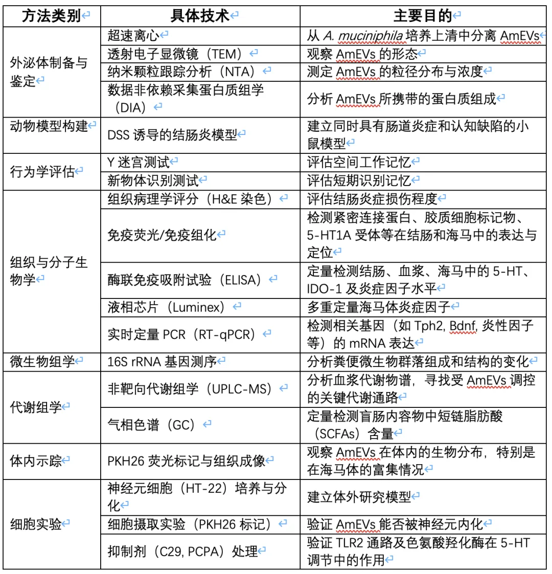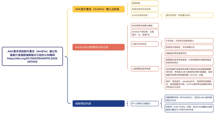 本研究针对阿克曼氏菌(A. muciniphila)产生的胞外囊泡(AmEVs)进行深入研究,确认其通过肠-脑轴的色氨酸代谢重编程减轻结肠炎相关的认知障碍。研究采用了多层次、系统性的实验流程,从体内动物模型(行为、病理、屏障、菌群、代谢)到体外细胞机制验证,结合了组学技术和分子生物学方法,全面阐述了AmEVs通过调节“肠道菌群-屏障-色氨酸代谢-神经炎症”轴来改善结肠炎相关认知障碍的作用与机制。本研究首次系统地证明,口服Akkermansia muciniphila来源的胞外囊泡(AmEVs)是一种能够同时靶向肠道和大脑的多功能纳米疗法。它通过修复屏障、抑制炎症、重塑菌群,并核心地通过双向重编程色氨酸代谢,最终修复突触功能,从而协同改善结肠炎及其相关的认知损伤,为治疗炎症性肠病相关的神经精神共病提供了全新的策略和理论依据。本研究遵循“临床问题 → 模型验证 → 机制深挖 → 细胞验证”的经典研究范式,系统地阐明了阿克曼菌胞外囊泡(AmEVs)如何通过“肠-脑轴”改善结肠炎相关认知障碍。一、 核心实验材料制备
