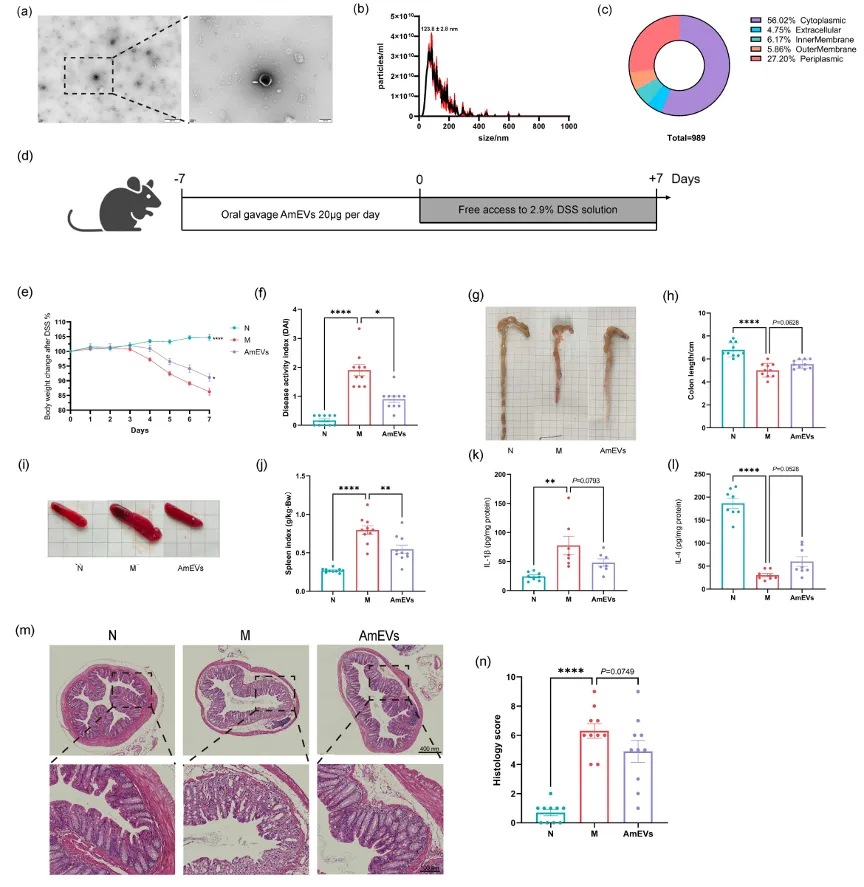 1. AmEV通过降低炎症反应和促进结肠粘膜修复改善DSS诱导的结肠炎嗜粘蛋白阿克曼氏菌(A. muciniphila)来源的细菌细胞外囊泡(AmEVs)的制备:通过超速离心获得AmEVs,电镜显示其呈盘状、具完整膜结构,粒径约123.8 nm,主要来源于细菌细胞质。