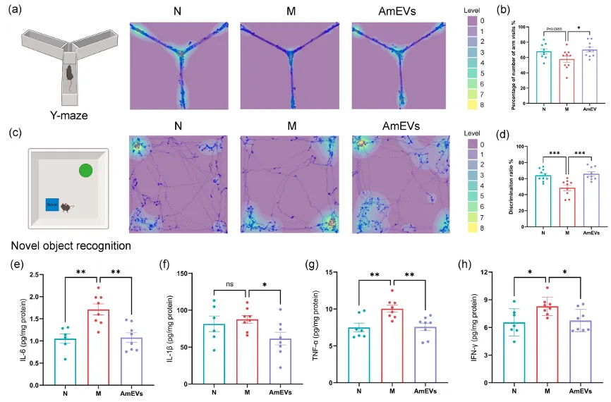 图1. AmEVs的制备及在缓解DSS诱导的结肠炎的作用在结肠炎模型中,使用AmEVs干预模型可以显著缓解疾病症状,包括改善模型体重维持、降低疾病活动指数(DAI)、减轻脾脏肿大,并在一定程度上改善结肠缩短和组织病理损伤,提示其可以促进粘膜修复。此外,AmEVs组还表现为促炎因子IL-1β水平下降、抗炎因子IL-4水平上升。总体表明,AmEVs通过增强抗炎作用和增强粘膜屏障功能有效改善结肠炎进展。2. AmEVs改善DSS诱导的认知功能障碍与神经炎症