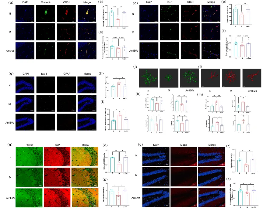 AmEVs处理组能有效逆转这一肠-脑轴病理级联:结肠和海马中Occludin、ZO-1等紧密连接蛋白等关键蛋白得到恢复表达,这修复肠道与BBB完整性;同时Iba-1(小胶质细胞)与GFAP(星形胶质细胞)的3D重构结果显示,AmEVs可以抑制其细胞活化形态,恢复静息态;此外,AmEVs组的海马组织突触蛋白SYP、PSD95表达恢复,神经元骨架蛋白MAP2+神经元修复,神经营养因子BDNF mRNA表达上调。