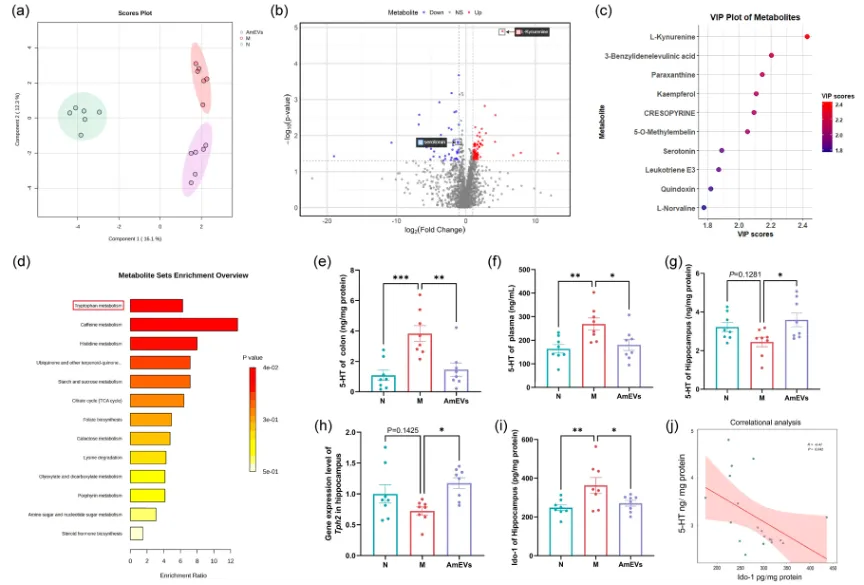 小鼠血浆非靶向代谢组学显示,AmEVs可显著改变血浆代谢谱,主要在色氨酸代谢与胆汁酸合成通路得到显著富集。结肠与血浆中5-HT在结肠炎模型组中过度升高,AmEVs处理后恢复至正常水平;海马中5-HT在结肠炎模型中降低,AmEVs处理后显著回升结肠炎模型组中的结肠组织和血浆中(5-HT)异常升高,而海马组织中的5-HT水平下降;