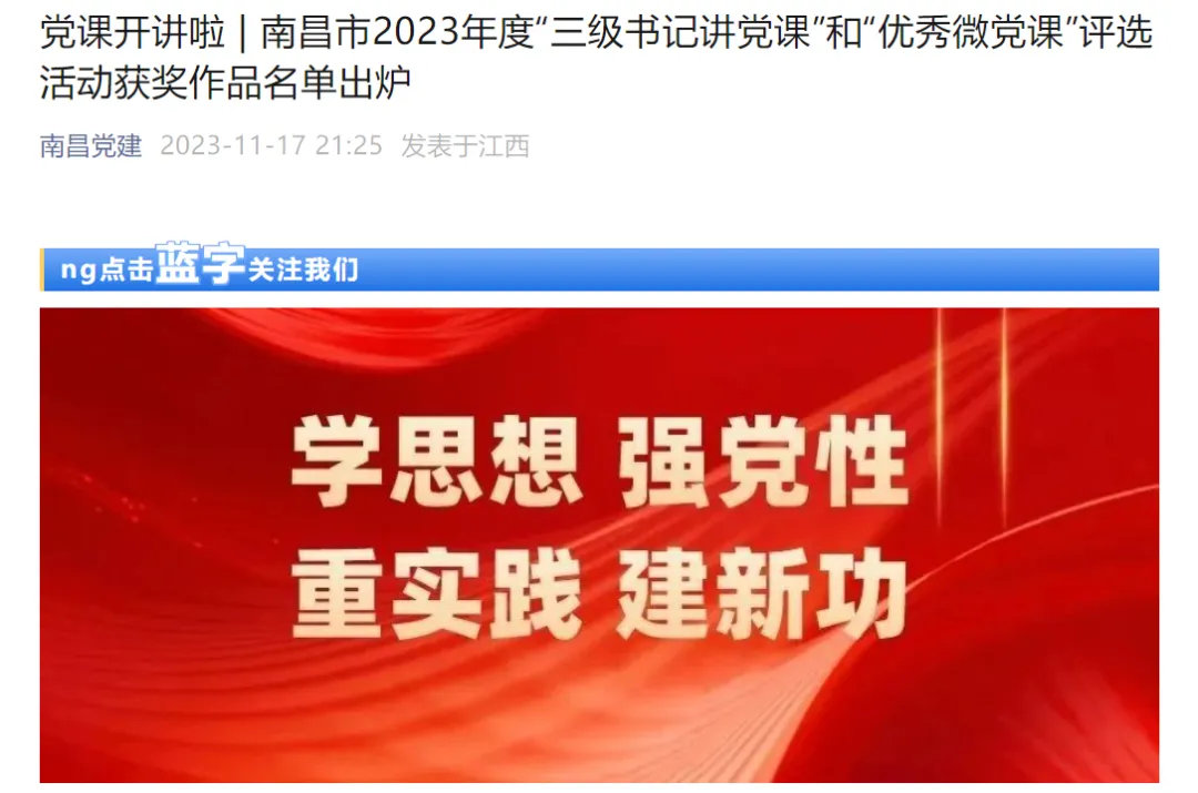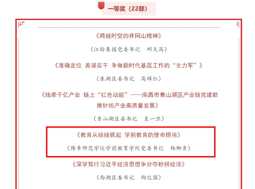 近期,根据中共南昌市委组织部印发的《关于开展2023年度优秀“三级书记讲党课”和优秀“微党课”评选活动的通知》,评定出“三级书记讲党课”优秀作品94部,其中一等奖22部、二等奖38部、三等奖34部。我院党委书记杨柳青主讲的《教育从娃娃抓起 学前教育的使命担当》专题党课在22部中排名前4,荣获一等奖。