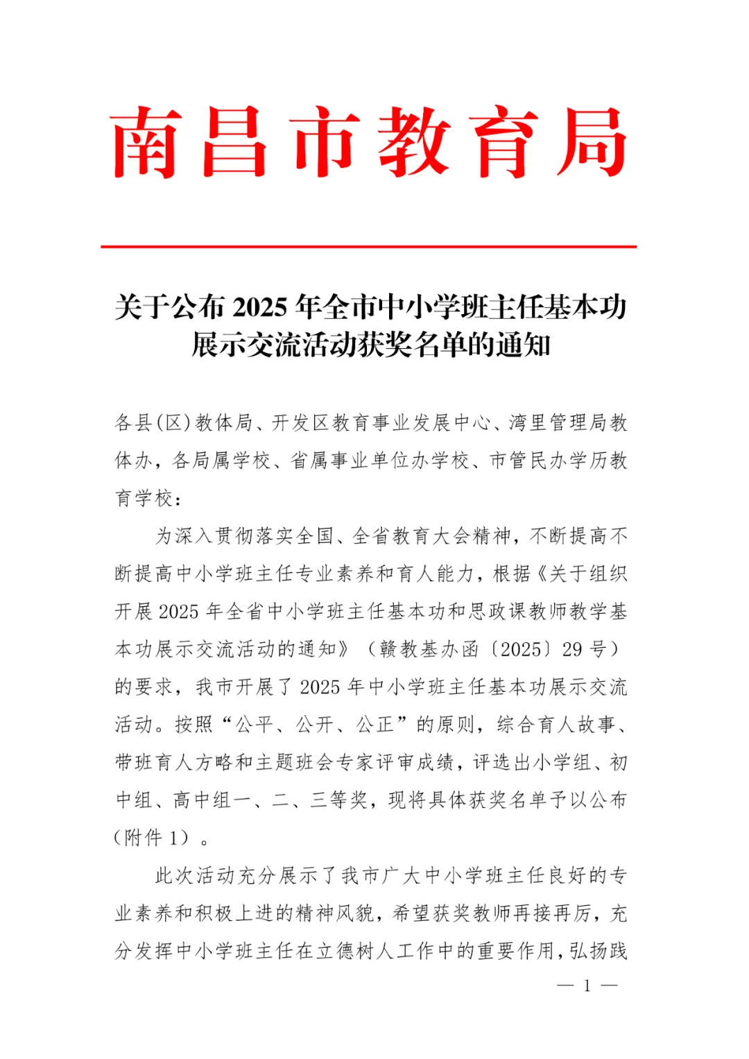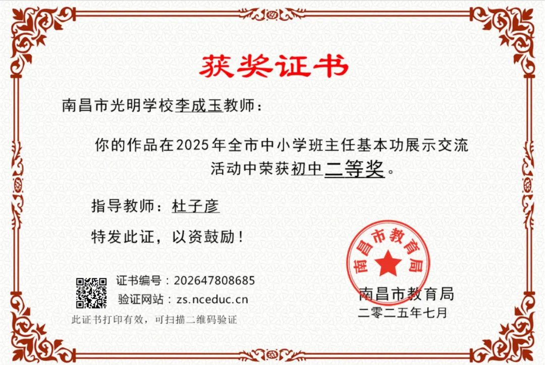 近日,南昌市教育局公布 2025年全市中小学班主任基本功展示交流活动获奖名单,豫章学校教育集团光明校区教师李成玉获初中组二等奖,杜子彦获优秀指导教师奖。