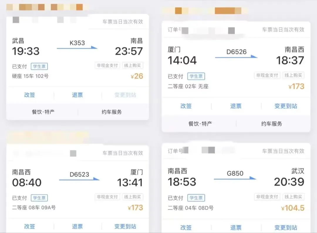23年五一,那是疫情过后我第一次在非寒暑假回家,很难抢票,最后抢票加候补,终于在出发前集齐了四张车票:武昌-南昌,南昌西-厦门,厦门-南昌西,南昌西-武汉。其实我不是回厦门,但奈何买不到票,只能买全程票,在泉州上下车,硬座、无座、二等座轮番体验,折腾至极,但为了回家,怎么样都值得。