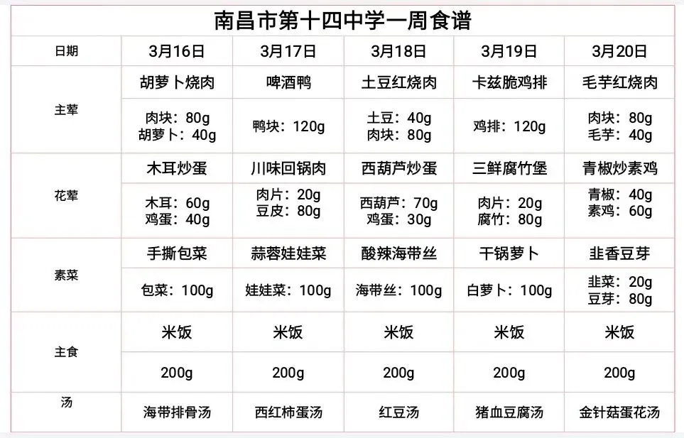 南昌十四中一周菜谱早知道(2026年3月16日-2026年3月20日)